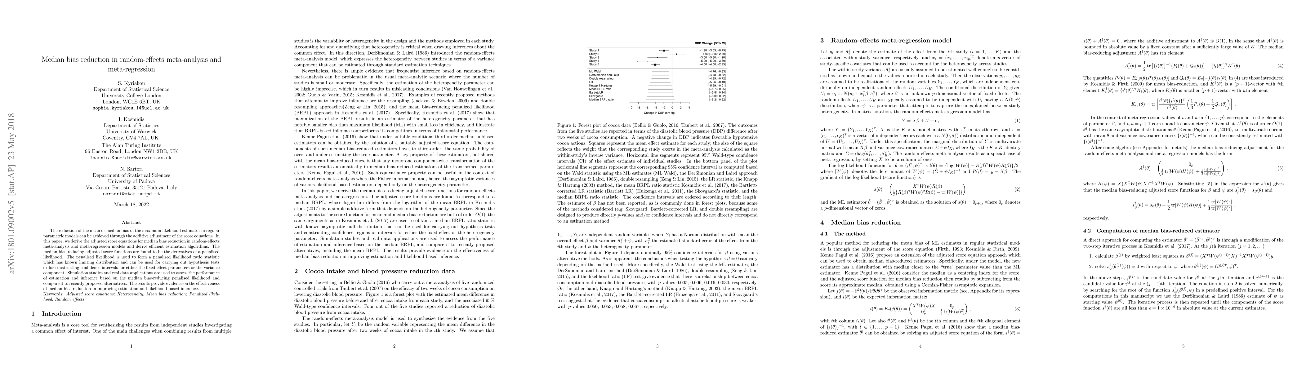 The paper derives adjusted score equations for median bias reduction of maximum likelihood estimators in random-effects meta-analysis and meta-regression, showing that maximizing the penalized log-likelihood leads to bias-reduced estimates.