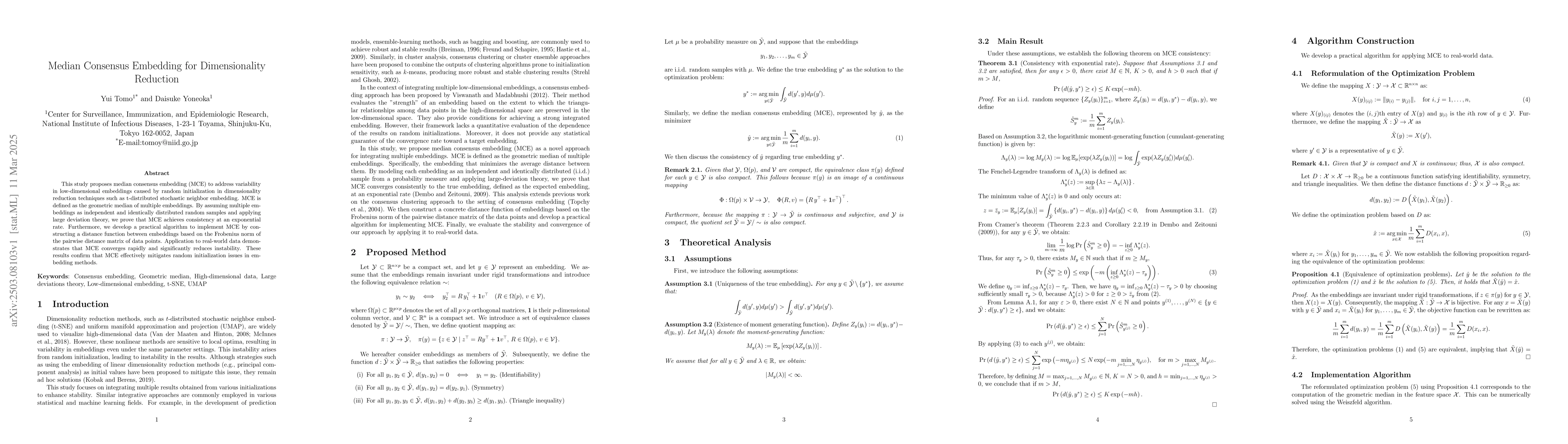 The research proposes Median Consensus Embedding (MCE) for dimensionality reduction, addressing variability caused by random initialization in techniques like t-SNE. MCE is defined as the geometric median of multiple embeddings, proven consistent at an exponential rate using large deviation theory. A practical algorithm based on the Frobenius norm of pairwise distance matrices is developed.