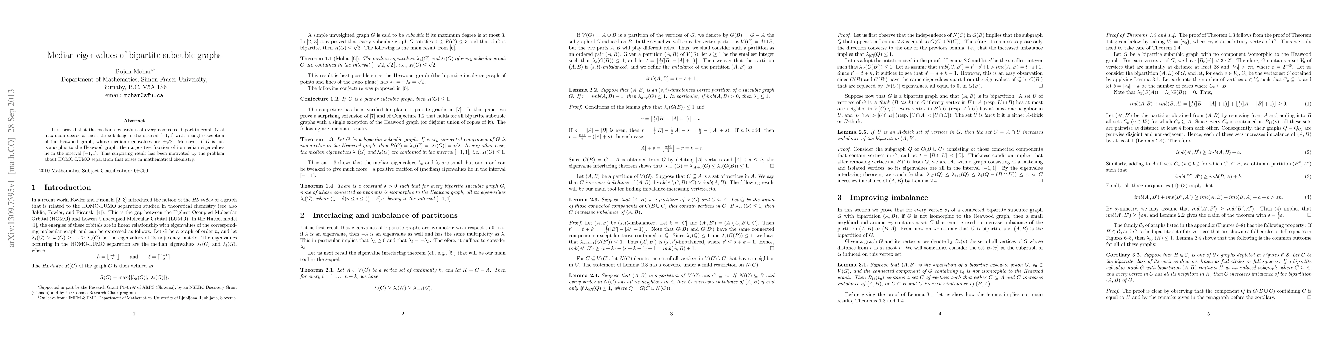 It is proved that the median eigenvalues of every connected bipartite graph $G$ of maximum degree at most three belong to the interval $[-1,1]$ with a single exception of the Heawood graph, whose median eigenvalues are $\pm\sqrt{2}$. Moreover, if $G$ is not isomorphic to the Heawood graph, then a positive fraction of its median eigenvalues lie in the interval $[-1,1]$. This surprising result has been motivated by the problem about HOMO-LUMO separation that arises in mathematical chemistry.
