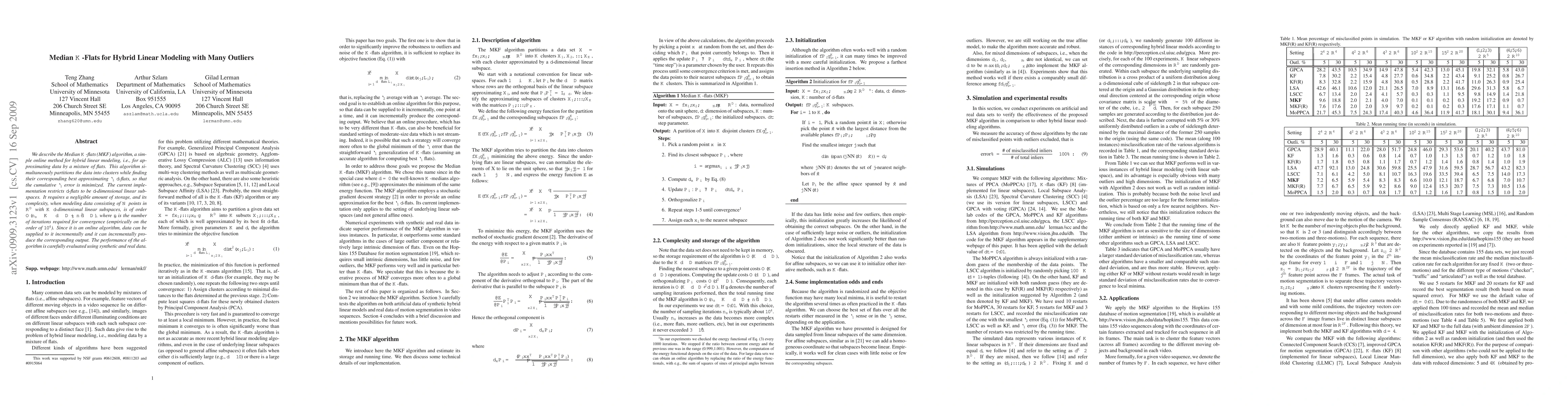 The Median K-Flats (MKF) algorithm is an online method for hybrid linear modeling that partitions data into clusters and finds their best approximating l1 d-flats to minimize cumulative l1 error. It has low storage requirements and is efficient with a complexity of O(n K d D + n d^2 D).