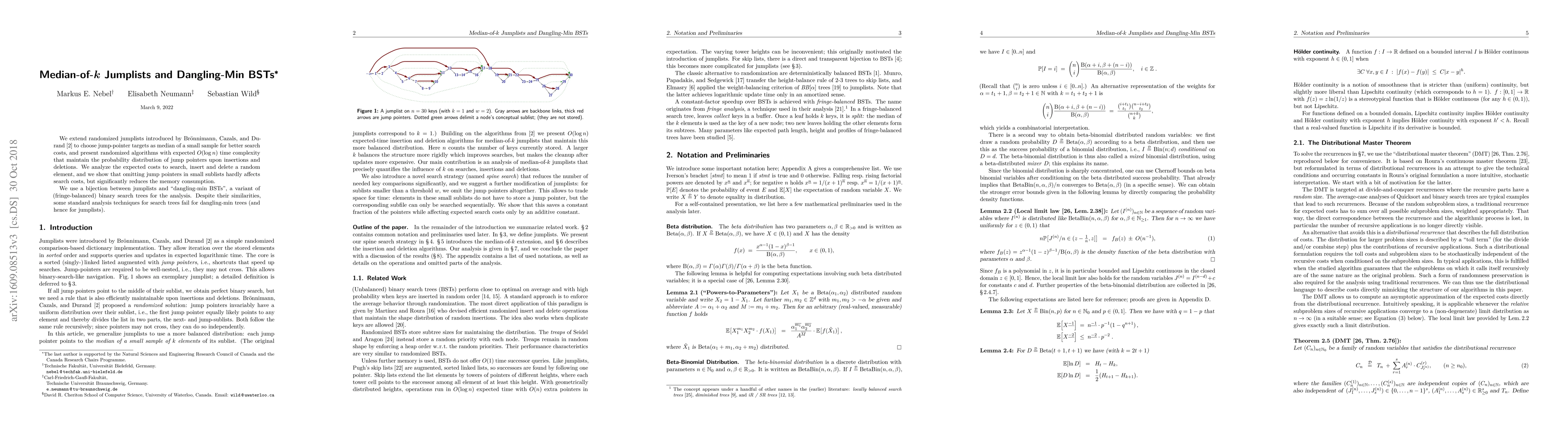 We extend randomized jumplists introduced by Br\"onnimann et al. (STACS 2003) to choose jump-pointer targets as median of a small sample for better search costs, and present randomized algorithms with expected $O(\log n)$ time complexity that maintain the probability distribution of jump pointers upon insertions and deletions. We analyze the expected costs to search, insert and delete a random element, and we show that omitting jump pointers in small sublists hardly affects search costs, but significantly reduces the memory consumption. We use a bijection between jumplists and "dangling-min BSTs", a variant of (fringe-balanced) binary search trees for the analysis. Despite their similarities, some standard analysis techniques for search trees fail for dangling-min trees (and hence for jumplists).