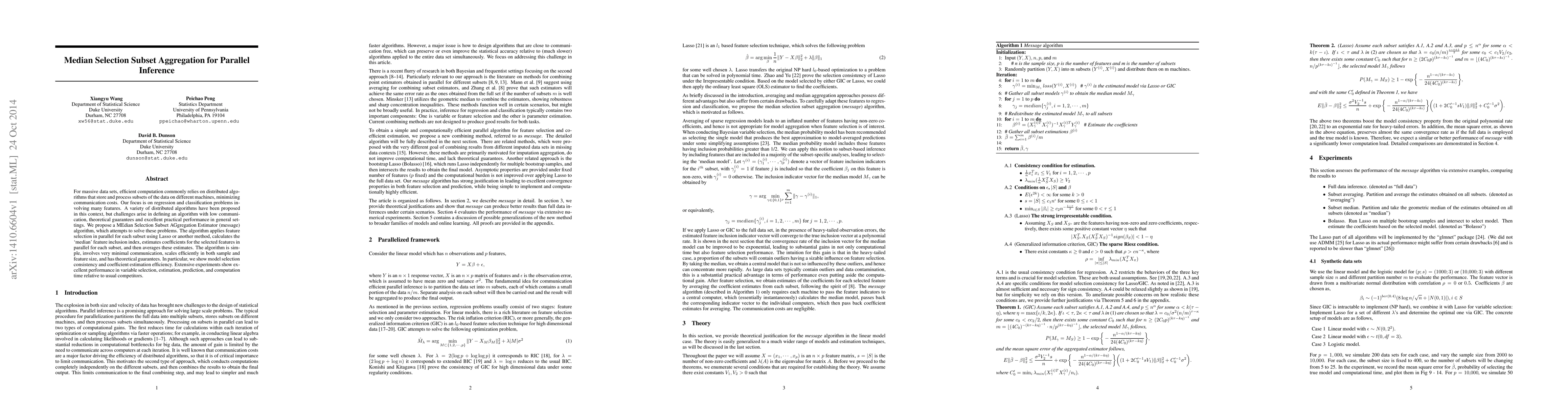 The paper proposes a MEdian Selection Subset AGgregation Estimator (message) algorithm for distributed computation in regression and classification tasks with many features. The algorithm selects features in parallel, calculates a median feature inclusion index, and averages estimates, achieving low communication, theoretical consistency, and efficient scaling.