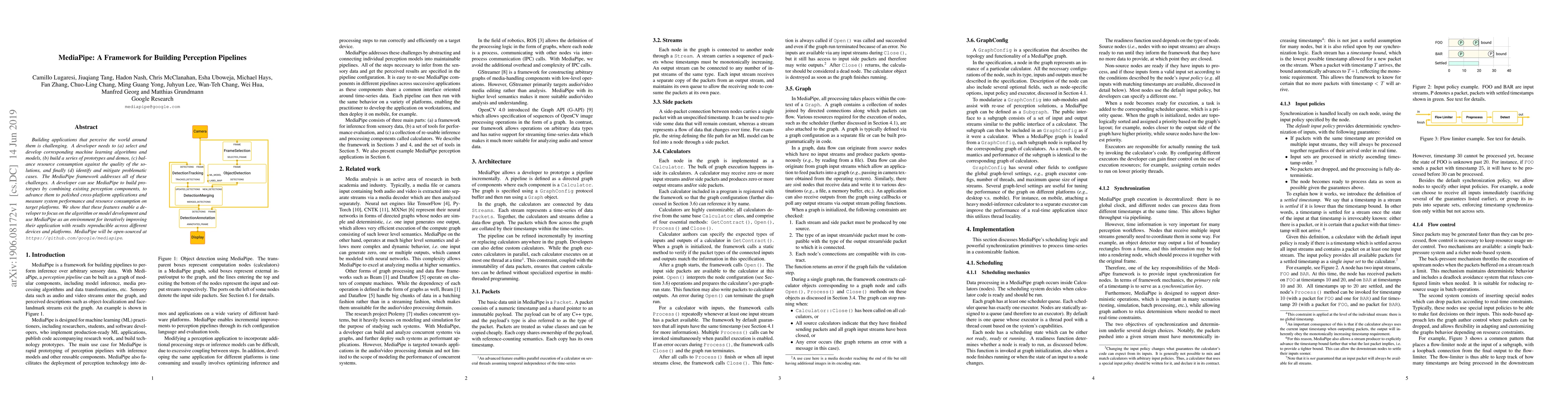 Building applications that perceive the world around them is challenging. A developer needs to (a) select and develop corresponding machine learning algorithms and models, (b) build a series of prototypes and demos, (c) balance resource consumption against the quality of the solutions, and finally (d) identify and mitigate problematic cases. The MediaPipe framework addresses all of these challenges. A developer can use MediaPipe to build prototypes by combining existing perception components, to advance them to polished cross-platform applications and measure system performance and resource consumption on target platforms. We show that these features enable a developer to focus on the algorithm or model development and use MediaPipe as an environment for iteratively improving their application with results reproducible across different devices and platforms. MediaPipe will be open-sourced at https://github.com/google/mediapipe.