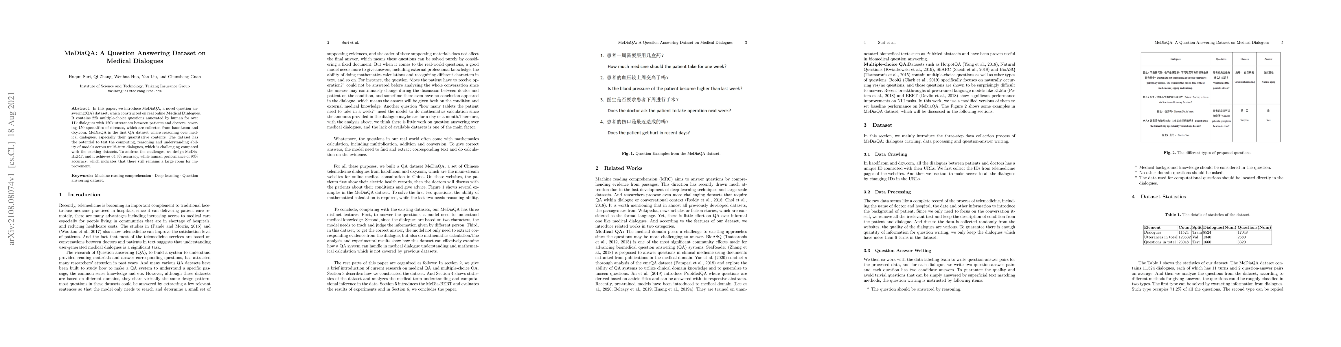 In this paper, we introduce MeDiaQA, a novel question answering(QA) dataset, which constructed on real online Medical Dialogues. It contains 22k multiple-choice questions annotated by human for over 11k dialogues with 120k utterances between patients and doctors, covering 150 specialties of diseases, which are collected from haodf.com and dxy.com. MeDiaQA is the first QA dataset where reasoning over medical dialogues, especially their quantitative contents. The dataset has the potential to test the computing, reasoning and understanding ability of models across multi-turn dialogues, which is challenging compared with the existing datasets. To address the challenges, we design MeDia-BERT, and it achieves 64.3% accuracy, while human performance of 93% accuracy, which indicates that there still remains a large room for improvement.