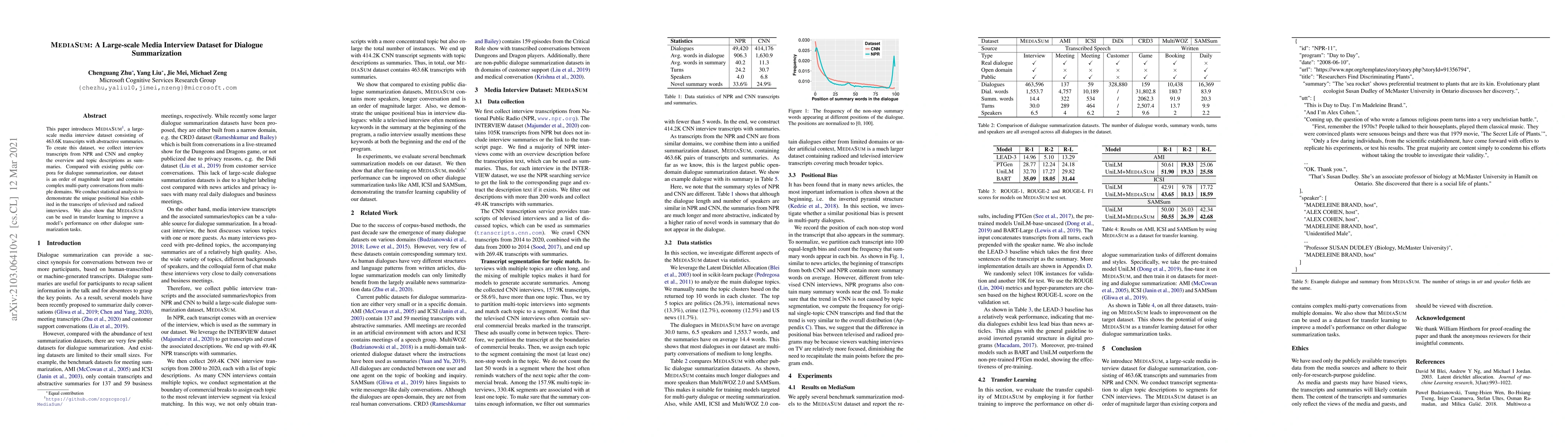 MediaSum is a vast dataset of 463.6K media interview transcripts with abstractive summaries, sourced from NPR and CNN. It significantly outperforms existing corpora in size and complexity, showcasing unique positional biases and enhancing transfer learning for dialogue summarization tasks.