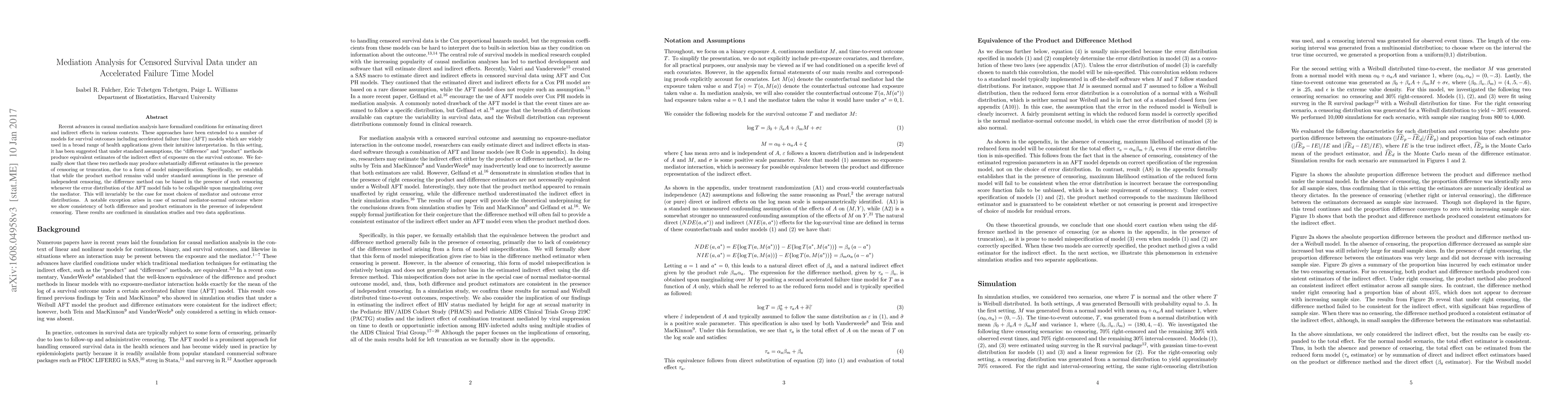 This paper investigates the equivalence of "difference" and "product" methods in estimating indirect effects in censored survival data under an accelerated failure time model, revealing that the difference method can be biased due to model misspecification when censoring is present, except in the case of normal distributions for both mediator and outcome. Simulation studies and real-data applications confirm these findings.