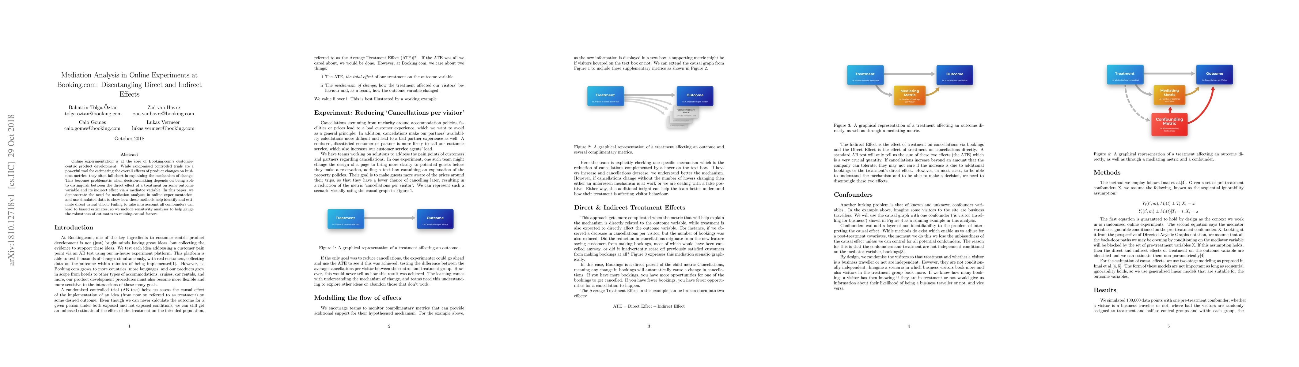 This paper explores the application of mediation analysis in online experiments at Booking.com to distinguish between direct and indirect effects of product changes. It highlights the importance of such analyses to understand causal mechanisms and includes sensitivity analyses to assess the robustness of estimates against potential confounders.