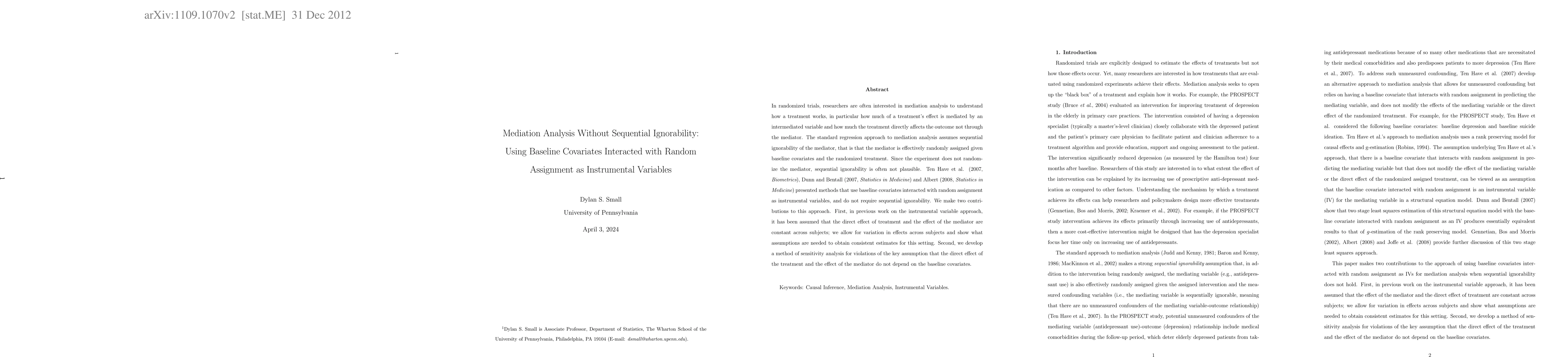 This paper proposes a mediation analysis method using baseline covariates interacted with random assignment as instrumental variables, which does not require sequential ignorability. It allows for variation in treatment and mediator effects across subjects and develops a sensitivity analysis for potential violations of key assumptions.