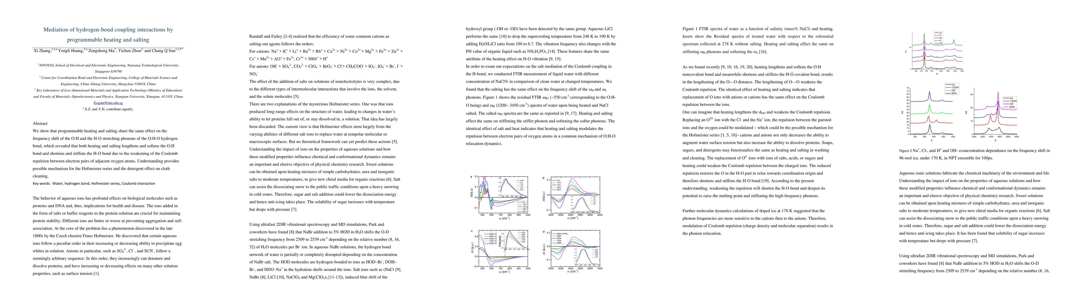 We show that programmable heating and salting share the same effect on the frequency shift of the O:H and the H-O stretching phonons of the O:H-O hydrogen bond, which revealed that both heating and salting lengthens and softens the O:H bond and shortens and stiffens the H-O bond due to the weakening of the Coulomb repulsion between electron pairs of adjacent oxygen atoms. Understanding provides possible mechanism for the Hofmeister series and the detergent effect on cloth cleaning.
