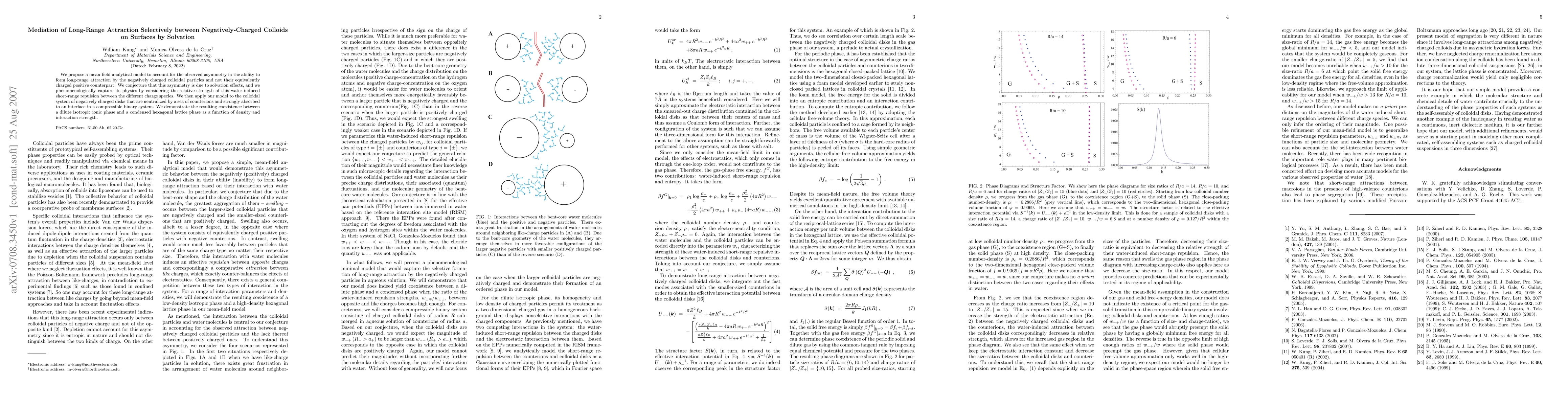 This paper presents a mean-field analytical model explaining the selective long-range attraction between negatively charged colloids due to solvation effects, contrasting with their positively charged counterparts. The model demonstrates the coexistence of different phases in a colloidal system of negatively charged disks neutralized by counterions.