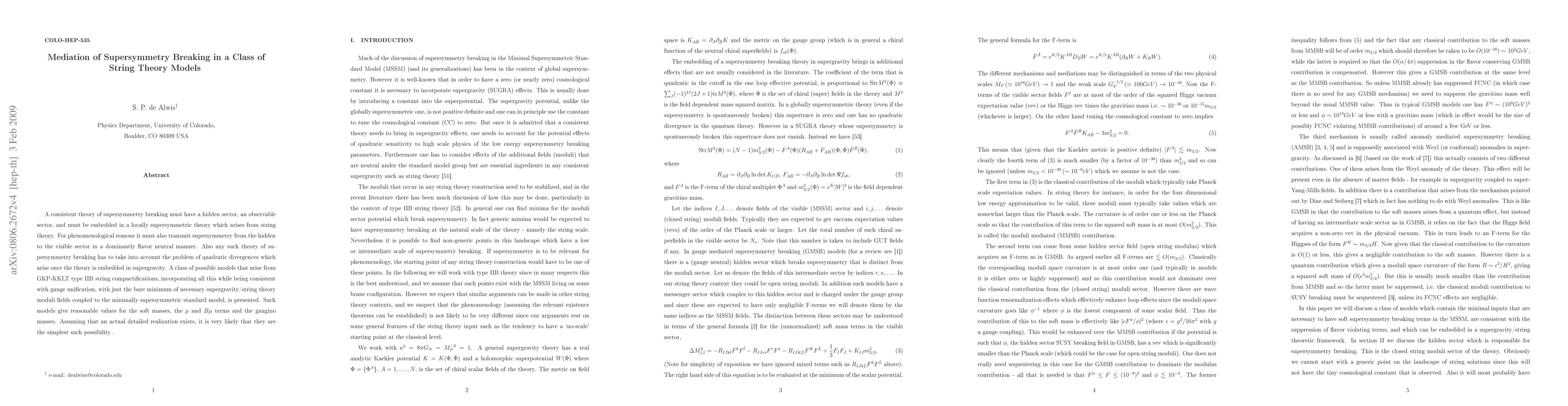 A consistent theory of supersymmetry breaking must have a hidden sector, an observable sector, and must be embedded in a locally supersymmetric theory which arises from string theory. For phenomenological reasons it must also transmit supersymmetry from the hidden to the visible sector in a dominantly flavor neutral manner. Also any such theory of supersymmetry breaking has to take into account the problem of quadratic divergences which arise once the theory is embedded in supergravity. A class of possible models that arise from GKP-KKLT type IIB string compactifications, incorporating all this while being consistent with gauge unification, with just the bare minimum of necessary supergravity/string theory moduli fields coupled to the minimally supersymmetric standard model, is presented. Such models give reasonable values for the soft masses, the $\mu$ and $B\mu$ terms and the gaugino masses. Assuming that an actual detailed realization exists, it is very likely that they are the simplest such possibility .