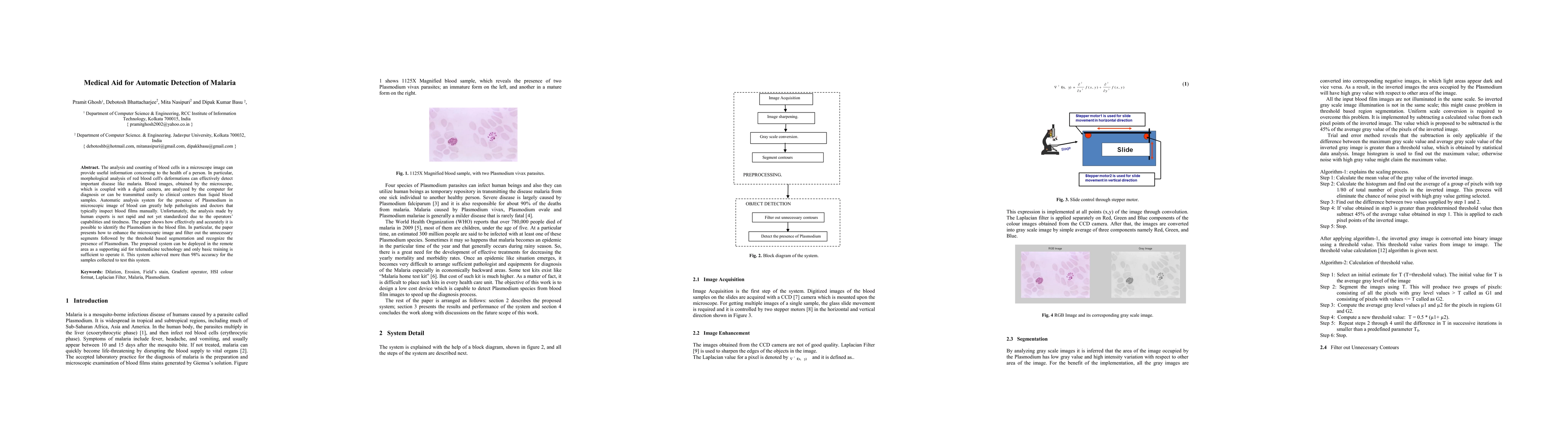 The analysis and counting of blood cells in a microscope image can provide useful information concerning to the health of a person. In particular, morphological analysis of red blood cells deformations can effectively detect important disease like malaria. Blood images, obtained by the microscope, which is coupled with a digital camera, are analyzed by the computer for diagnosis or can be transmitted easily to clinical centers than liquid blood samples. Automatic analysis system for the presence of Plasmodium in microscopic image of blood can greatly help pathologists and doctors that typically inspect blood films manually. Unfortunately, the analysis made by human experts is not rapid and not yet standardized due to the operators capabilities and tiredness. The paper shows how effectively and accurately it is possible to identify the Plasmodium in the blood film. In particular, the paper presents how to enhance the microscopic image and filter out the unnecessary segments followed by the threshold based segmentation and recognize the presence of Plasmodium. The proposed system can be deployed in the remote area as a supporting aid for telemedicine technology and only basic training is sufficient to operate it. This system achieved more than 98 percentage accuracy for the samples collected to test this system.