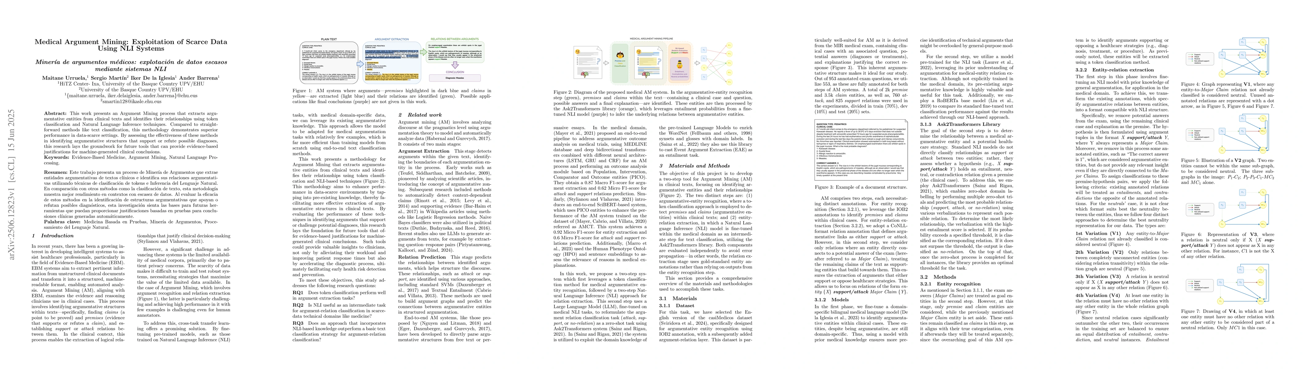 This work presents an Argument Mining process that extracts argumentative entities from clinical texts and identifies their relationships using token classification and Natural Language Inference techniques. Compared to straightforward methods like text classification, this methodology demonstrates superior performance in data-scarce settings. By assessing the effectiveness of these methods in identifying argumentative structures that support or refute possible diagnoses, this research lays the groundwork for future tools that can provide evidence-based justifications for machine-generated clinical conclusions.