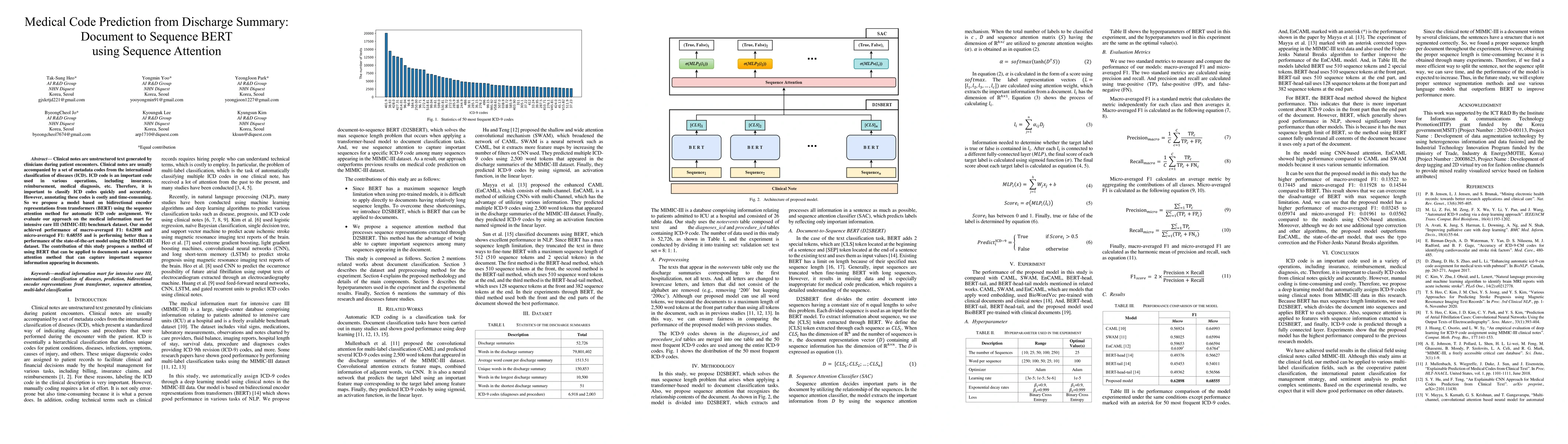 Clinical notes are unstructured text generated by clinicians during patient encounters. Clinical notes are usually accompanied by a set of metadata codes from the International Classification of Diseases(ICD). ICD code is an important code used in various operations, including insurance, reimbursement, medical diagnosis, etc. Therefore, it is important to classify ICD codes quickly and accurately. However, annotating these codes is costly and time-consuming. So we propose a model based on bidirectional encoder representations from transformers (BERT) using the sequence attention method for automatic ICD code assignment. We evaluate our approach on the medical information mart for intensive care III (MIMIC-III) benchmark dataset. Our model achieved performance of macro-averaged F1: 0.62898 and micro-averaged F1: 0.68555 and is performing better than a performance of the state-of-the-art model using the MIMIC-III dataset. The contribution of this study proposes a method of using BERT that can be applied to documents and a sequence attention method that can capture important sequence in-formation appearing in documents.