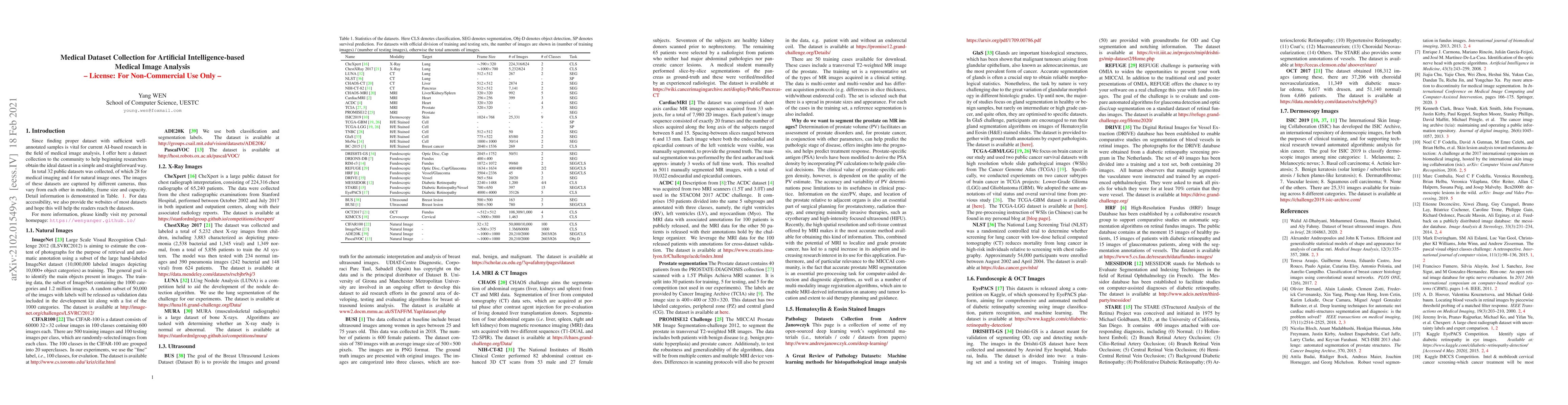 We collected 32 public datasets, of which 28 for medical imaging and 4 for natural images, to conduct study. The images of these datasets are captured by different cameras, thus vary from each other in modality, frame size and capacity. For data accessibility, we also provide the websites of most datasets and hope this will help the readers reach the datasets.