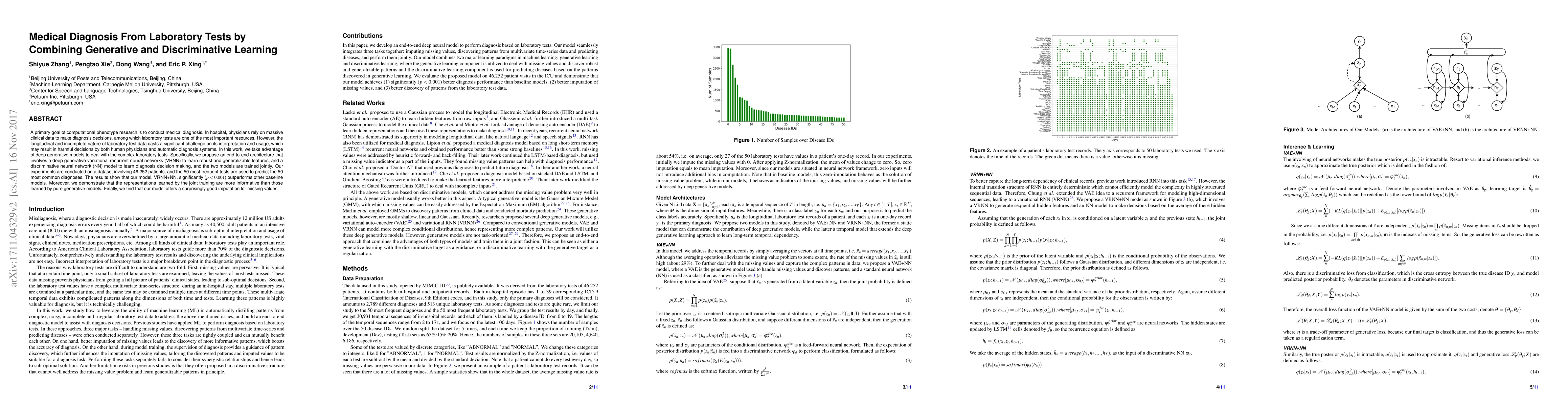 This paper proposes a hybrid model combining generative and discriminative learning to improve medical diagnosis from laboratory test data. The model uses a deep generative VRNN for feature learning and a discriminative neural network for decision making, achieving superior performance compared to baseline models.
