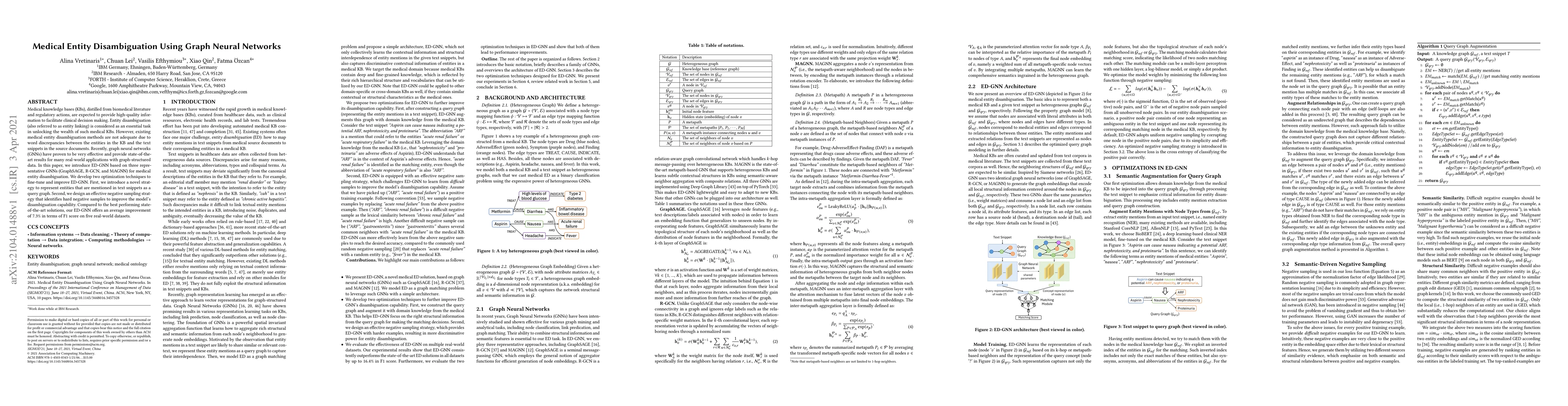 This paper proposes ED-GNN, a graph neural network-based approach for medical entity disambiguation using GraphSAGE, R-GCN, and MAGNN. It introduces optimization techniques including a query graph representation and hard negative sampling, achieving an average 7.3% improvement in F1 score over existing methods on five datasets.