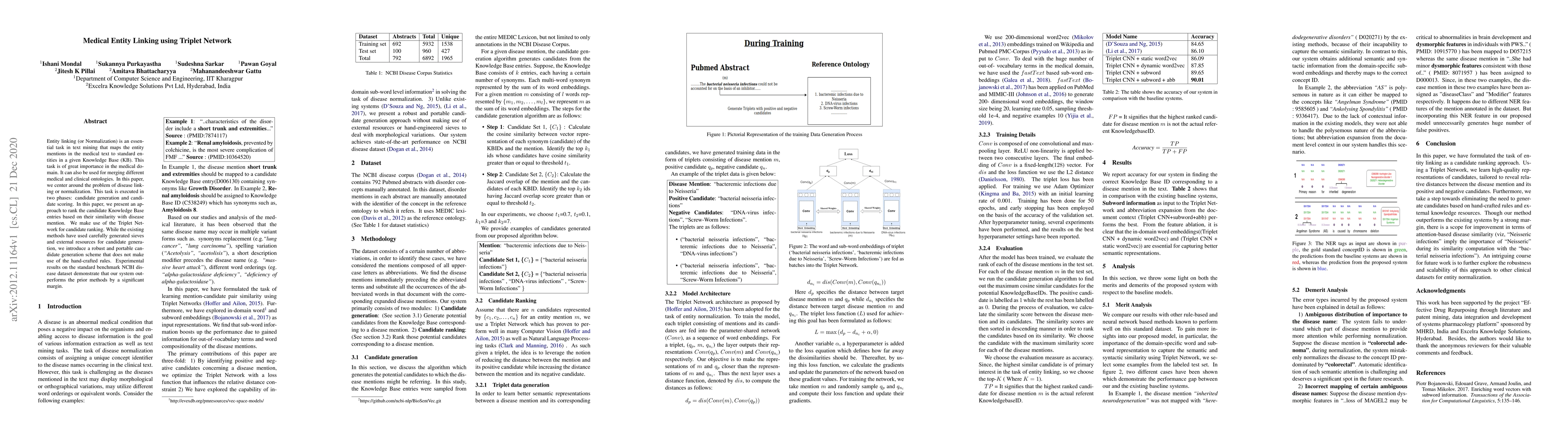 This paper proposes a Triplet Network approach for medical entity linking, specifically for disease normalization, which ranks Knowledge Base entries based on similarity to disease mentions. Unlike previous methods, it uses a robust candidate generation scheme without hand-crafted rules, achieving superior performance on the NCBI disease dataset.