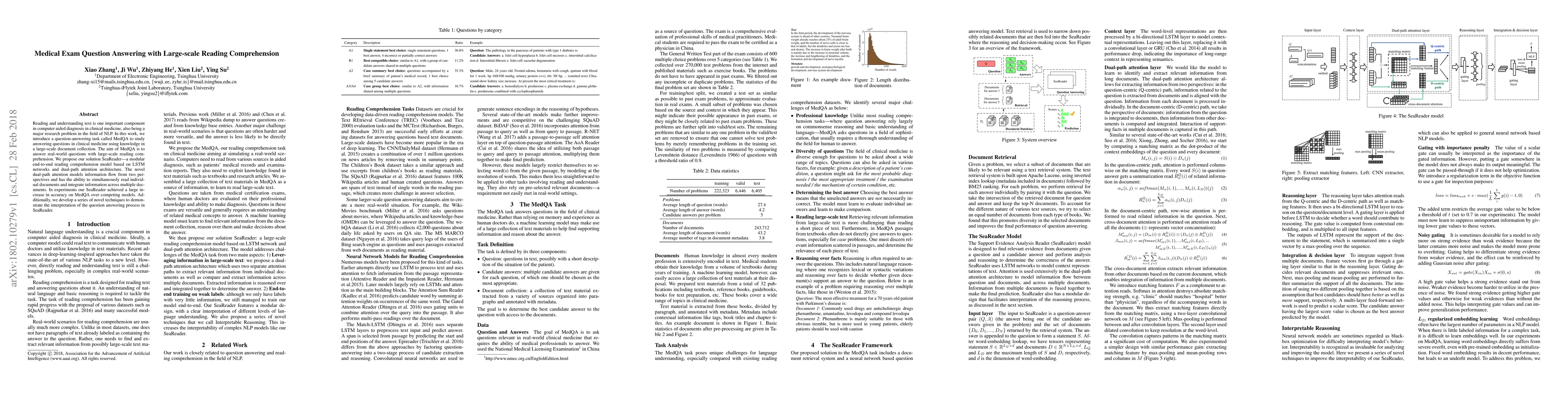 This paper introduces MedQA, a question-answering task for clinical medicine using large-scale reading comprehension. The proposed SeaReader model, based on LSTM networks and dual-path attention, significantly improves accuracy on MedQA by effectively integrating information across multiple documents.