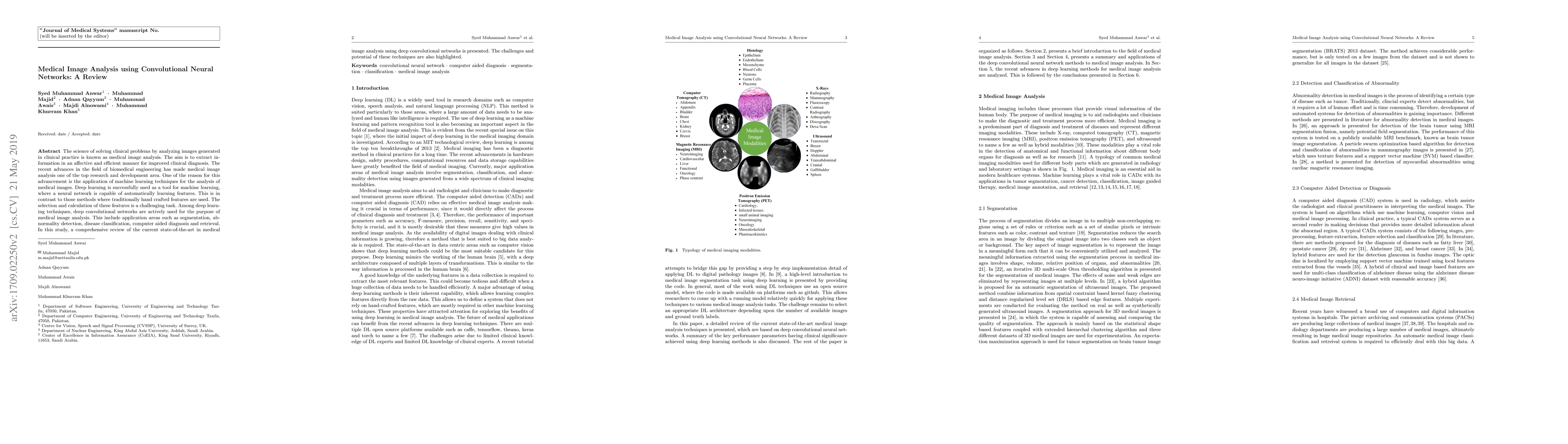 This paper reviews the current state-of-the-art in medical image analysis using convolutional neural networks, highlighting their applications in segmentation, detection, classification, and diagnosis, while also discussing associated challenges and future potential.