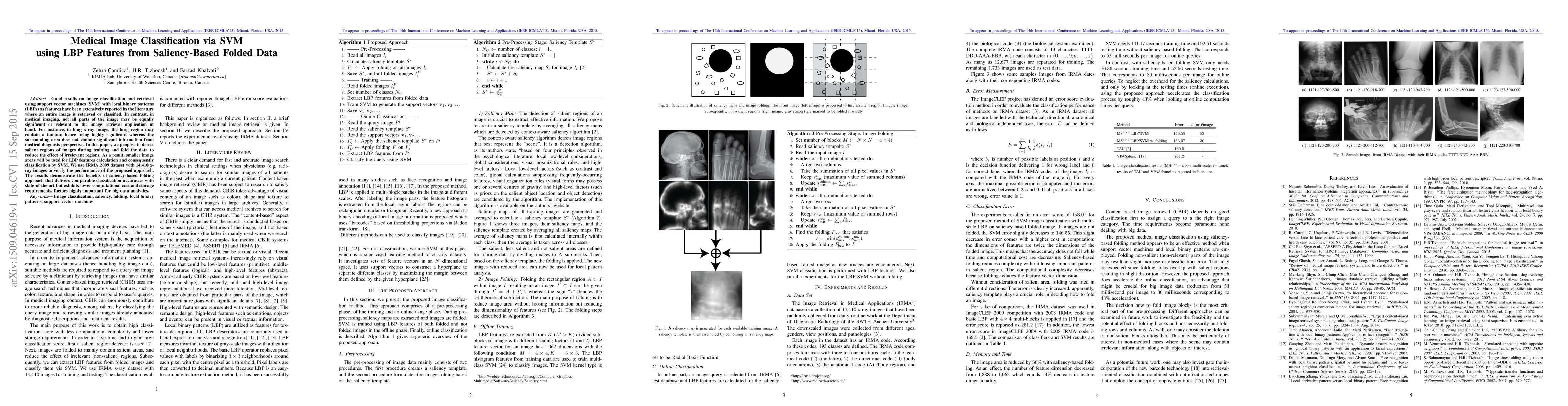This paper proposes a new approach for medical image classification using LBP features from saliency-based folded data, achieving comparable accuracy with lower computational cost and storage requirements.