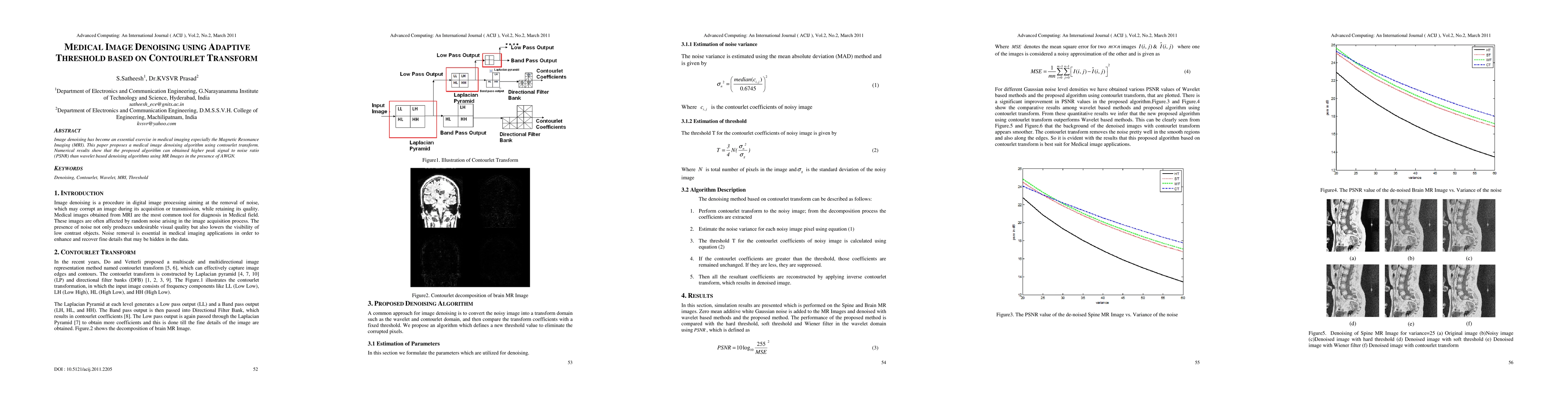 Summary: This paper introduces a medical image denoising method based on the contourlet transform with adaptive thresholding, achieving higher peak signal-to-noise ratio (PSNR) compared to wavelet-based methods, particularly for MRI images corrupted by additive white Gaussian noise (AWGN).