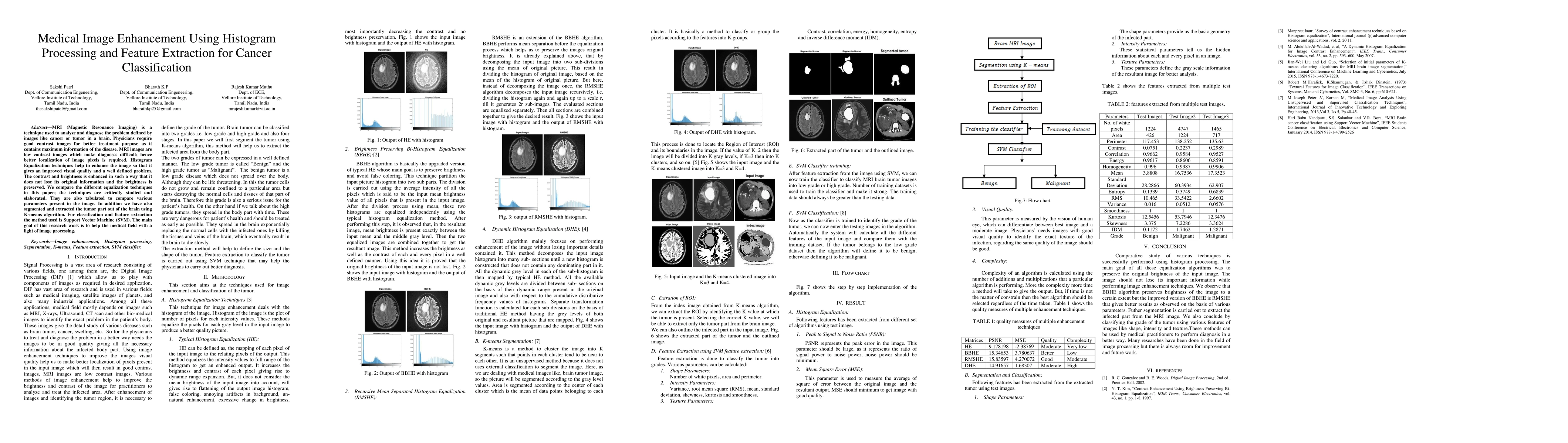 This paper investigates MRI image enhancement using histogram processing and feature extraction for cancer classification. It employs histogram equalization techniques to improve image contrast and brightness while preserving original information, followed by K-means segmentation and SVM classification for tumor detection and feature extraction.