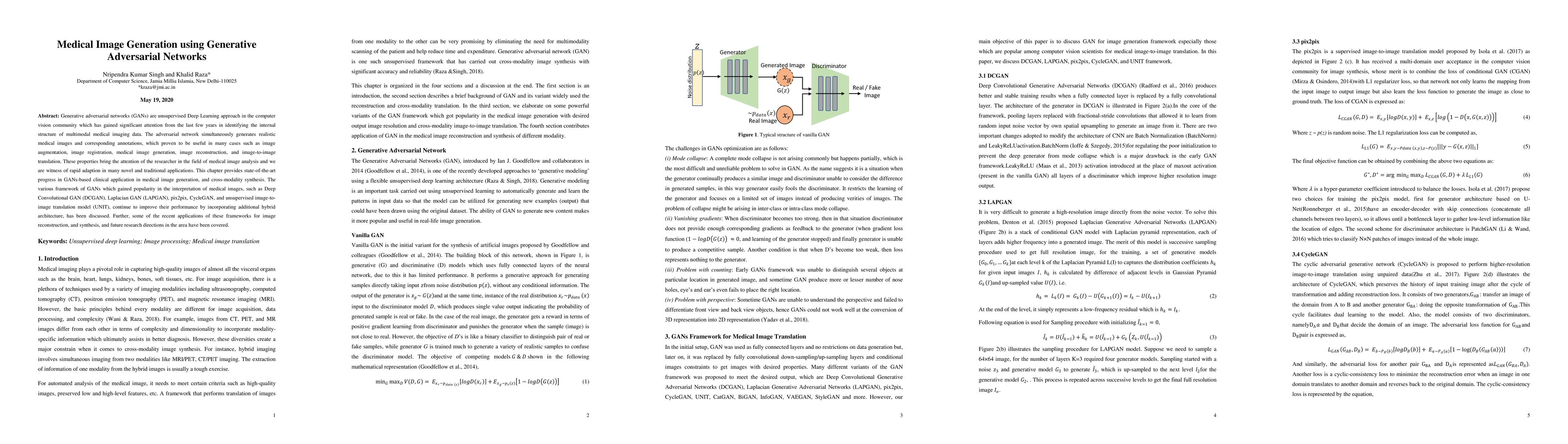 Generative adversarial networks (GANs) are unsupervised Deep Learning approach in the computer vision community which has gained significant attention from the last few years in identifying the internal structure of multimodal medical imaging data. The adversarial network simultaneously generates realistic medical images and corresponding annotations, which proven to be useful in many cases such as image augmentation, image registration, medical image generation, image reconstruction, and image-to-image translation. These properties bring the attention of the researcher in the field of medical image analysis and we are witness of rapid adaption in many novel and traditional applications. This chapter provides state-of-the-art progress in GANs-based clinical application in medical image generation, and cross-modality synthesis. The various framework of GANs which gained popularity in the interpretation of medical images, such as Deep Convolutional GAN (DCGAN), Laplacian GAN (LAPGAN), pix2pix, CycleGAN, and unsupervised image-to-image translation model (UNIT), continue to improve their performance by incorporating additional hybrid architecture, has been discussed. Further, some of the recent applications of these frameworks for image reconstruction, and synthesis, and future research directions in the area have been covered.