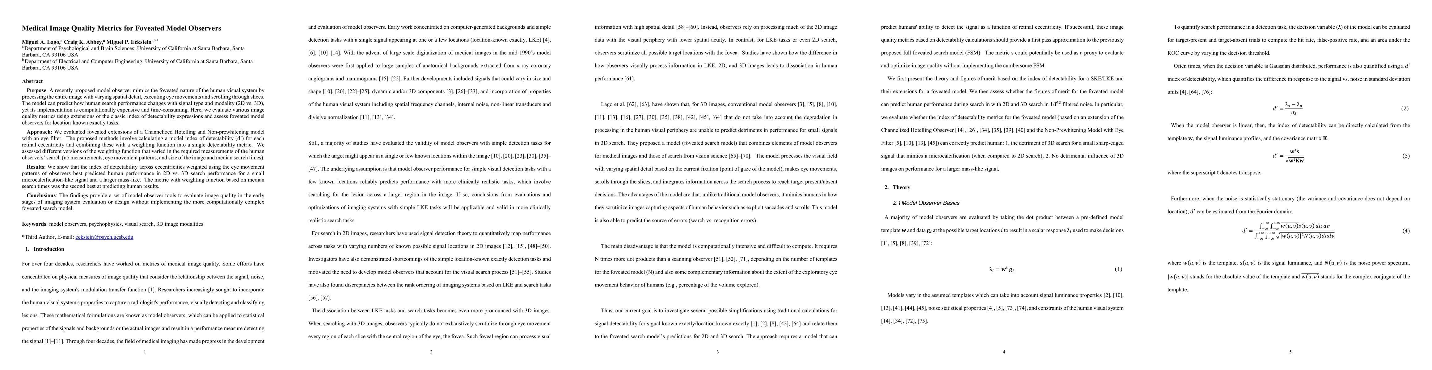A recently proposed model observer mimics the foveated nature of the human visual system by processing the entire image with varying spatial detail, executing eye movements and scrolling through slices. The model can predict how human search performance changes with signal type and modality (2D vs. 3D), yet its implementation is computationally expensive and time-consuming. Here, we evaluate various image quality metrics using extensions of the classic index of detectability expressions and assess foveated model observers for location-known exactly tasks. We evaluated foveated extensions of a Channelized Hotelling and Non-prewhitening model with an eye filter. The proposed methods involve calculating a model index of detectability (d') for each retinal eccentricity and combining these with a weighting function into a single detectability metric. We assessed different versions of the weighting function that varied in the required measurements of the human observers' search (no measurements, eye movement patterns, and size of the image and median search times). We show that the index of detectability across eccentricities weighted using the eye movement patterns of observers best predicted human performance in 2D vs. 3D search performance for a small microcalcification-like signal and a larger mass-like. The metric with weighting function based on median search times was the second best at predicting human results. The findings provide a set of model observer tools to evaluate image quality in the early stages of imaging system evaluation or design without implementing the more computationally complex foveated search model.