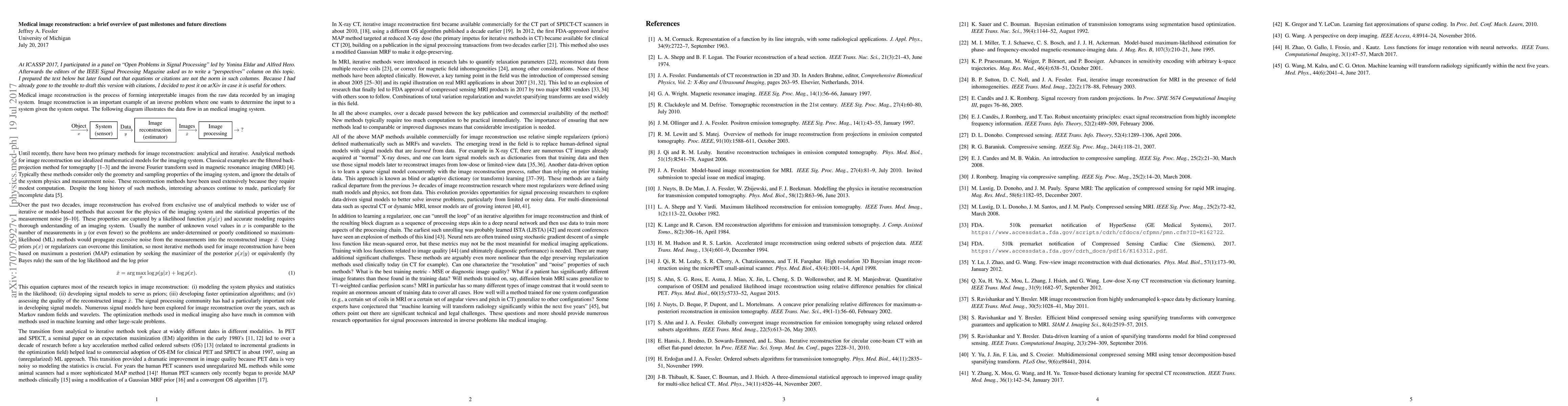 This paper reviews significant historical milestones in medical image reconstruction and outlines promising future directions, contributing to an overview on open problems in signal processing for IEEE Signal Processing Magazine. It includes relevant citations and mathematical equations to support the discussion.