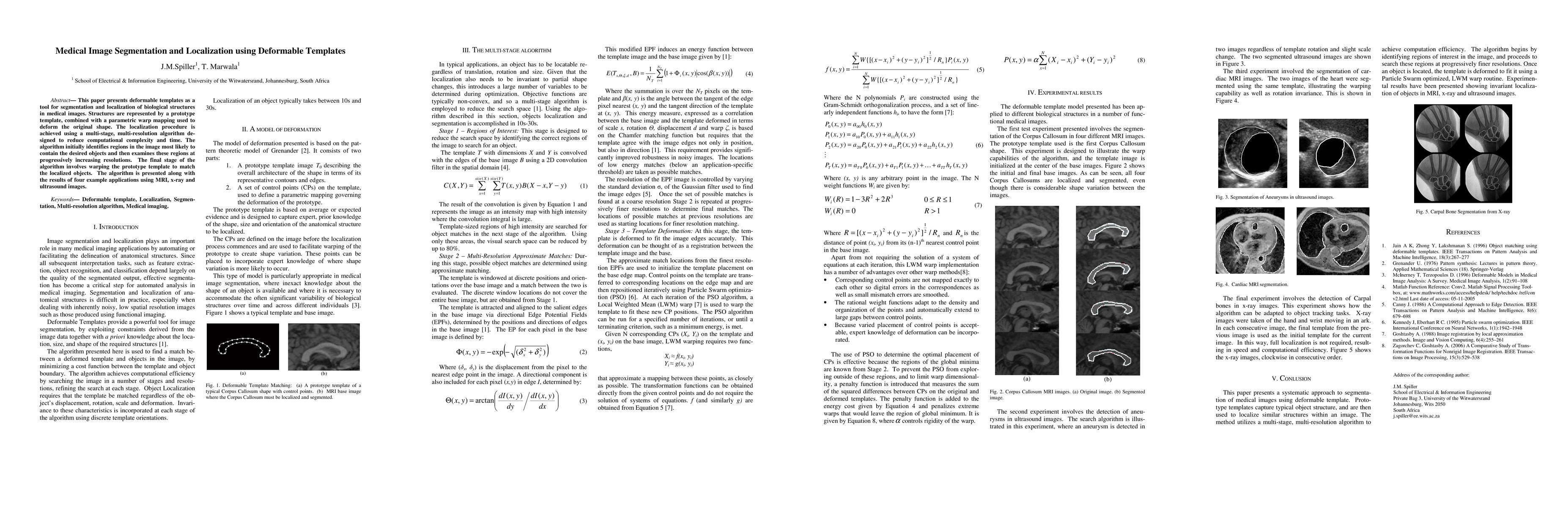 This paper presents deformable templates as a tool for segmentation and localization of biological structures in medical images. Structures are represented by a prototype template, combined with a parametric warp mapping used to deform the original shape. The localization procedure is achieved using a multi-stage, multi-resolution algorithm de-signed to reduce computational complexity and time. The algorithm initially identifies regions in the image most likely to contain the desired objects and then examines these regions at progressively increasing resolutions. The final stage of the algorithm involves warping the prototype template to match the localized objects. The algorithm is presented along with the results of four example applications using MRI, x-ray and ultrasound images.
