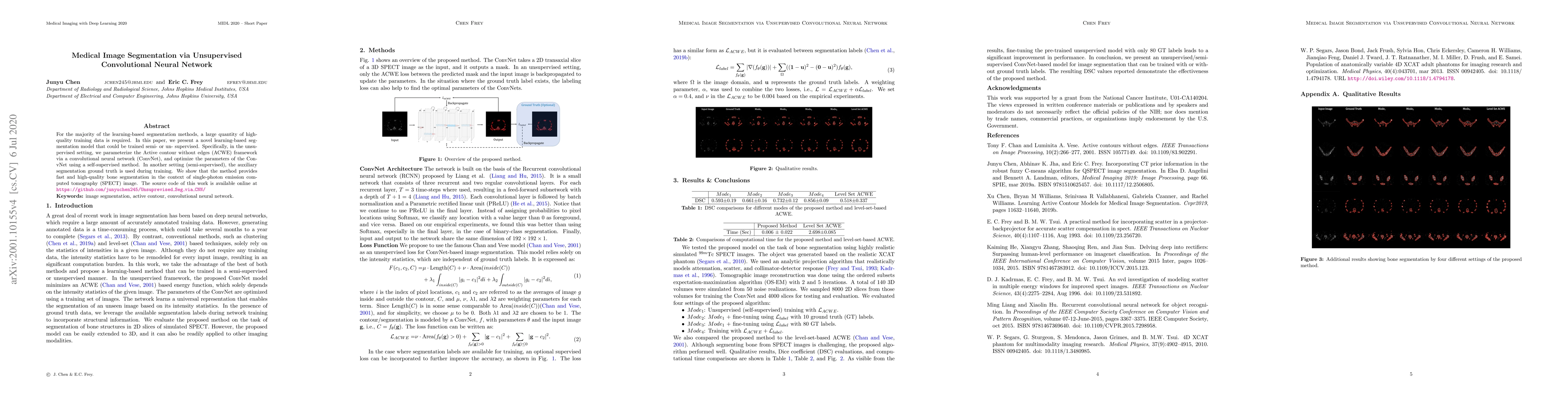 This paper introduces a novel unsupervised convolutional neural network (ConvNet) model for medical image segmentation, parameterizing the Active contour without edges (ACWE) framework. The model is optimized using a self-supervised method, demonstrating effective bone segmentation in SPECT images without requiring extensive labeled training data.