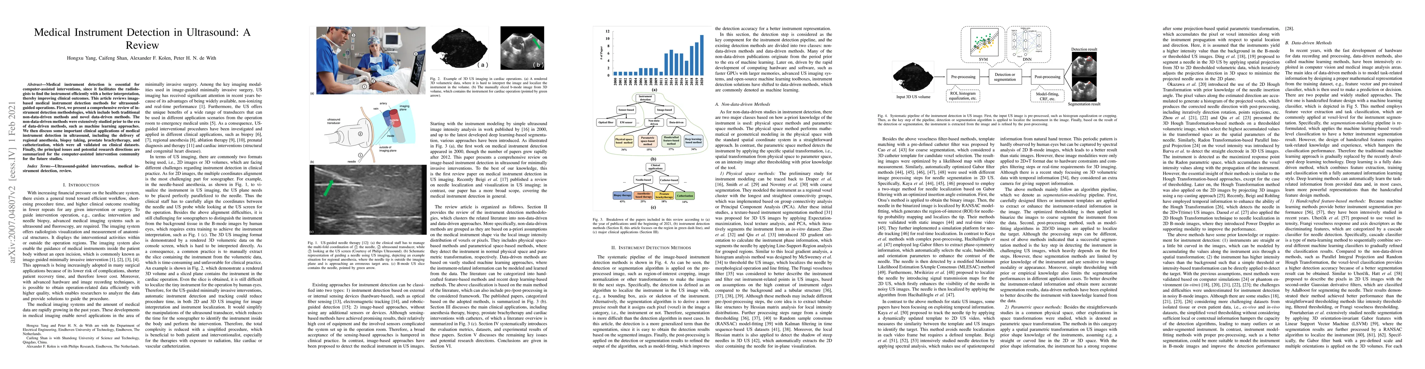 This paper reviews medical instrument detection methods in ultrasound-guided interventions, highlighting traditional non-data-driven and data-driven approaches for improving surgical outcomes. It summarizes key findings and potential research directions for the computer-assisted intervention community.