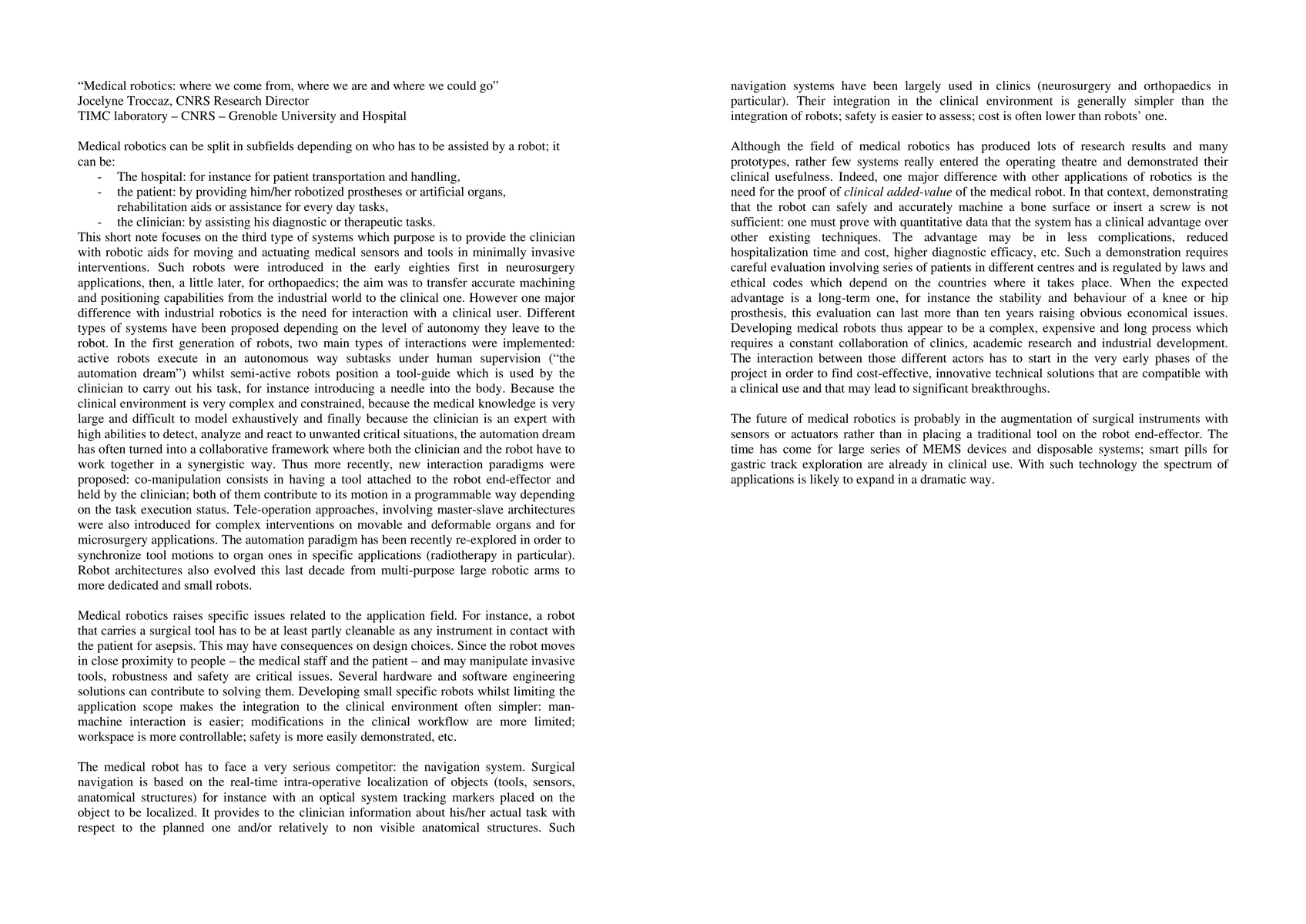 The paper discusses advancements in medical robotics interaction paradigms, robot architectures, and the challenges of integrating these systems into clinical environments.