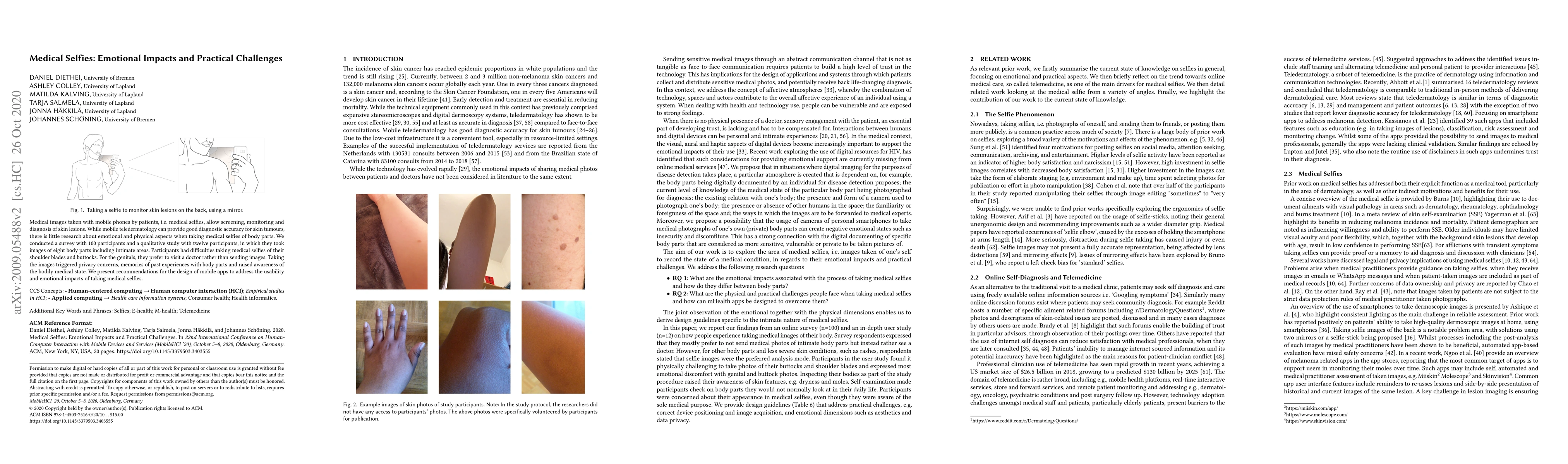 This study explores the emotional and practical challenges of patients taking 'medical selfies' for skin condition monitoring. Key findings indicate difficulties with capturing certain body parts, preference for doctor visits over sharing genital images, and privacy concerns. The research provides recommendations for mobile app design to address these issues.