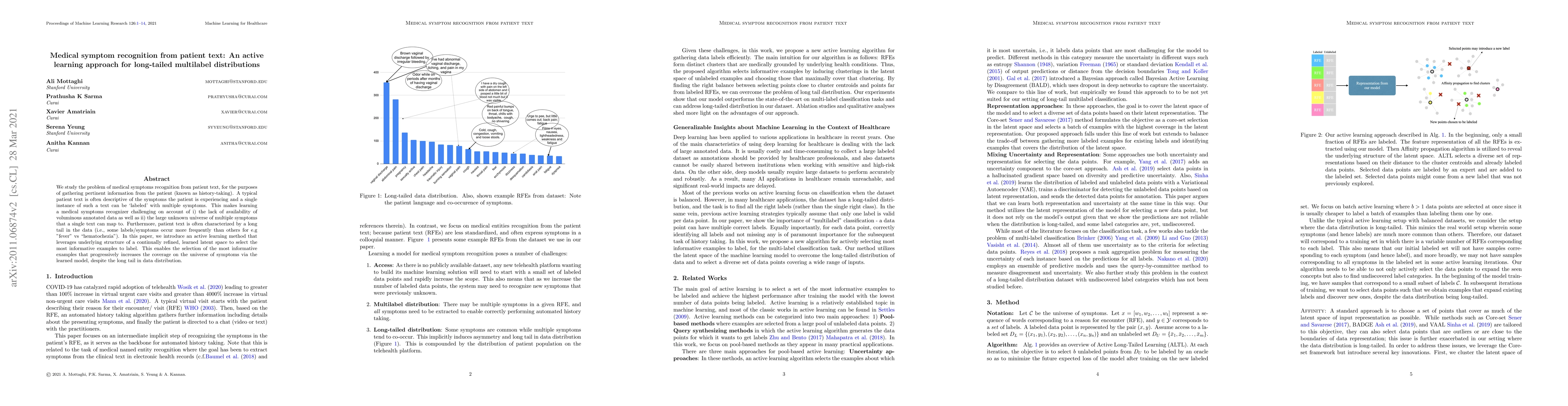 We study the problem of medical symptoms recognition from patient text, for the purposes of gathering pertinent information from the patient (known as history-taking). A typical patient text is often descriptive of the symptoms the patient is experiencing and a single instance of such a text can be "labeled" with multiple symptoms. This makes learning a medical symptoms recognizer challenging on account of i) the lack of availability of voluminous annotated data as well as ii) the large unknown universe of multiple symptoms that a single text can map to. Furthermore, patient text is often characterized by a long tail in the data (i.e., some labels/symptoms occur more frequently than others for e.g "fever" vs "hematochezia"). In this paper, we introduce an active learning method that leverages underlying structure of a continually refined, learned latent space to select the most informative examples to label. This enables the selection of the most informative examples that progressively increases the coverage on the universe of symptoms via the learned model, despite the long tail in data distribution.
