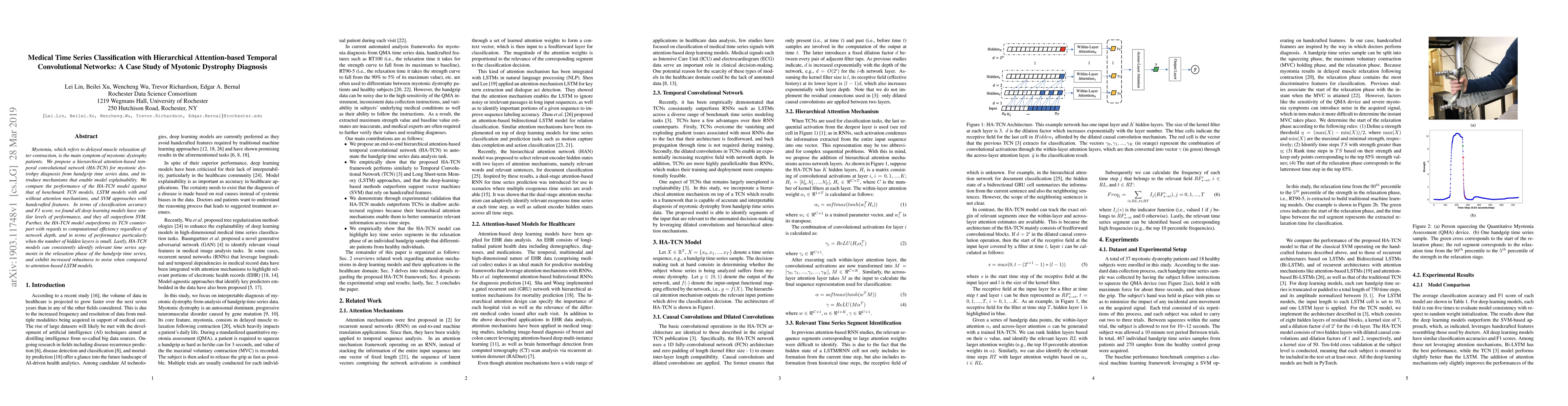This paper proposes a hierarchical attention-based temporal convolutional network (HA-TCN) for diagnosing myotonic dystrophy from handgrip time series data, demonstrating improved computational efficiency and robustness over benchmark models. The HA-TCN model outperforms traditional SVM and achieves comparable accuracy to other deep learning models, while also providing better explainability.