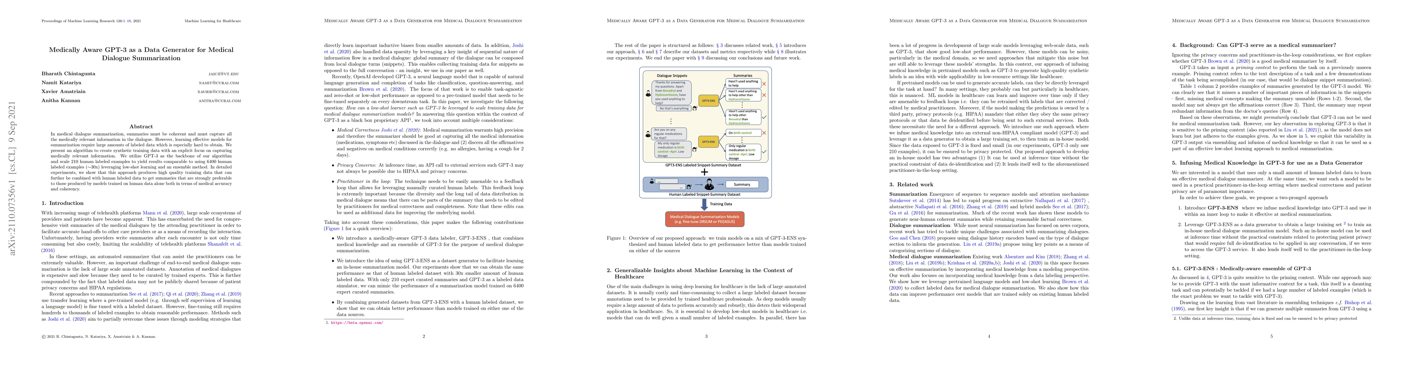 This paper proposes an algorithm using GPT-3 to generate synthetic training data for medical dialogue summarization, achieving results comparable to models trained on large human-labeled datasets by leveraging low-shot learning and ensemble methods. The generated data, when combined with human-labeled data, produces summaries that outperform those trained solely on human data in terms of medical accuracy and coherency.