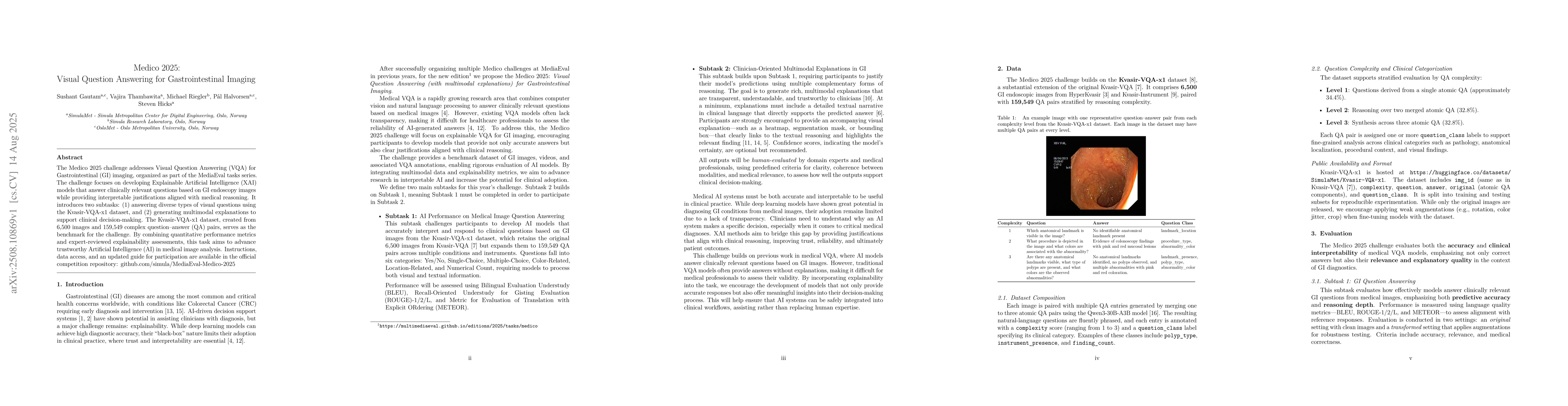 The Medico 2025 challenge addresses Visual Question Answering (VQA) for Gastrointestinal (GI) imaging, organized as part of the MediaEval task series. The challenge focuses on developing Explainable Artificial Intelligence (XAI) models that answer clinically relevant questions based on GI endoscopy images while providing interpretable justifications aligned with medical reasoning. It introduces two subtasks: (1) answering diverse types of visual questions using the Kvasir-VQA-x1 dataset, and (2) generating multimodal explanations to support clinical decision-making. The Kvasir-VQA-x1 dataset, created from 6,500 images and 159,549 complex question-answer (QA) pairs, serves as the benchmark for the challenge. By combining quantitative performance metrics and expert-reviewed explainability assessments, this task aims to advance trustworthy Artificial Intelligence (AI) in medical image analysis. Instructions, data access, and an updated guide for participation are available in the official competition repository: https://github.com/simula/MediaEval-Medico-2025