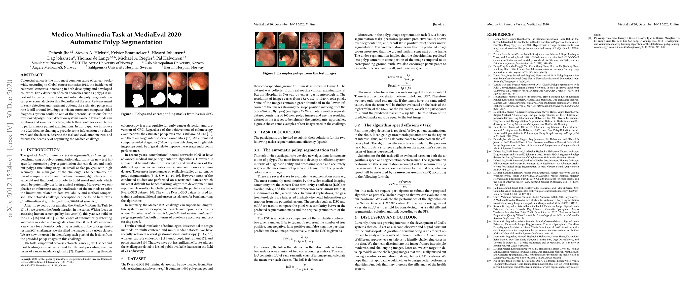 The Medico Multimedia Task at MediaEval 2020 focused on automatic polyp segmentation for early detection of colorectal cancer, aiming to reduce the estimated 20% polyp miss rate. The challenge provided a potential solution for overlooked polyps through low-cost computer-aided diagnosis systems.