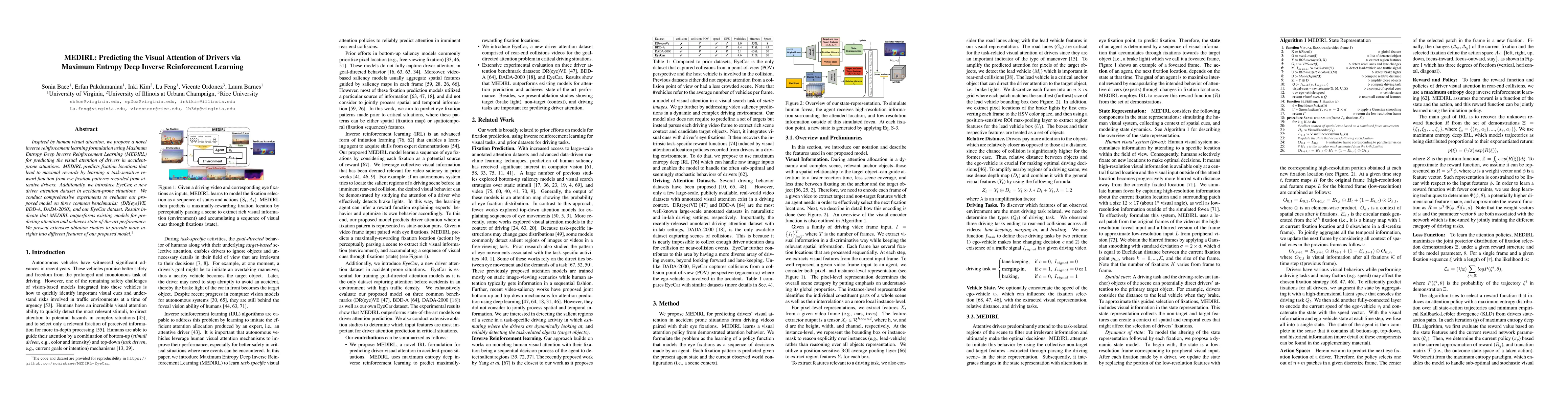 The paper proposes MEDIRL, a Maximum Entropy Deep Inverse Reinforcement Learning model, to predict drivers' visual attention in accident-prone situations by learning from eye fixation patterns. The model outperforms existing methods on multiple benchmarks and is supported by a new dataset, EyeCar.