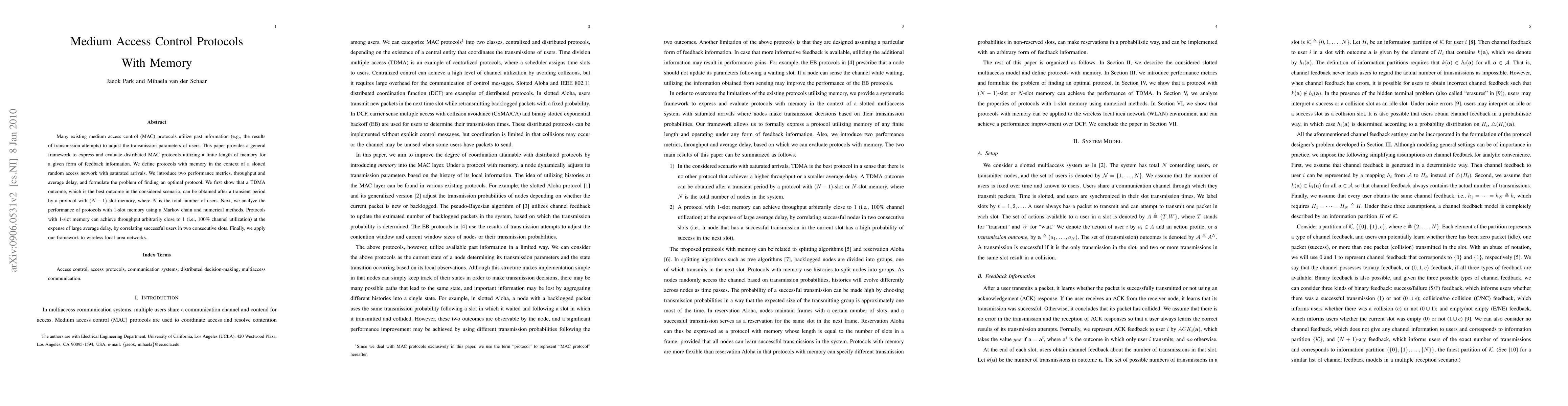 A new framework for medium access control protocols with memory is introduced to improve performance in slotted random access networks. Protocols with 1-slot memory can achieve high throughput but come at the cost of large average delay.