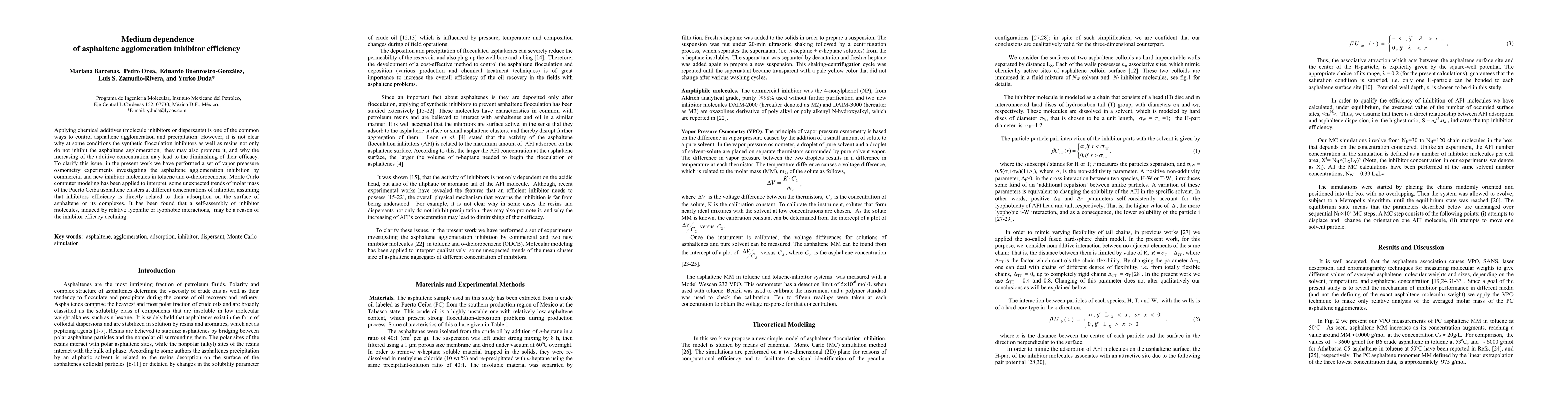 This study investigates the efficiency of asphaltene agglomeration inhibitors in different solvents, revealing that increasing inhibitor concentration can paradoxically reduce efficacy due to self-assembly of inhibitor molecules. Monte Carlo modeling suggests that these interactions can diminish inhibitor performance by altering adsorption on asphaltene surfaces.