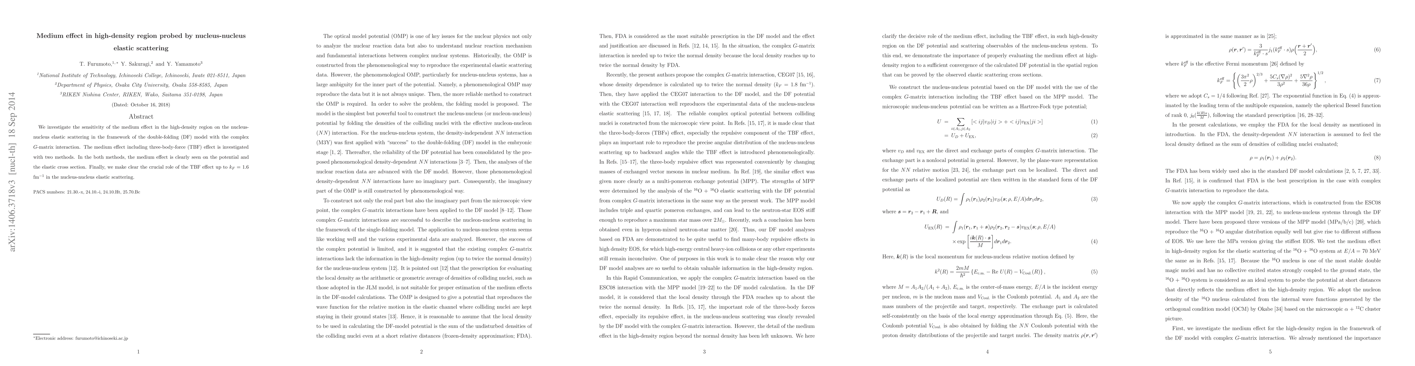 This paper examines the medium effect in high-density regions via nucleus-nucleus elastic scattering using the double-folding model with $G$-matrix interaction. The study reveals significant medium effects, including three-body-force influence, on the potential and elastic cross section, highlighting the crucial role of TBF up to $k_F = 1.6$ fm$^{-1}$.