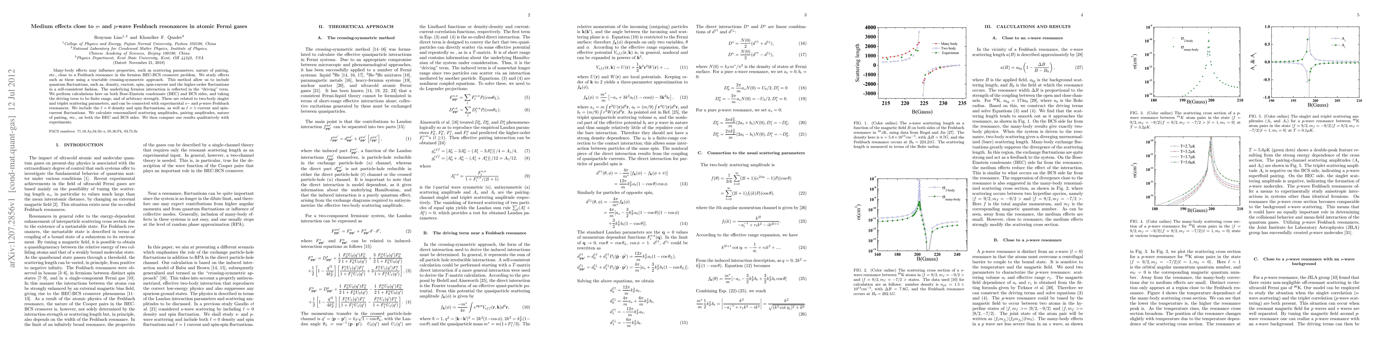 This paper investigates many-body effects near s- and p-wave Feshbach resonances in atomic Fermi gases using a crossing-symmetric approach that accounts for quantum fluctuations. The study calculates renormalized scattering and pairing amplitudes, comparing results with experimental observations on both the BEC and BCS sides.