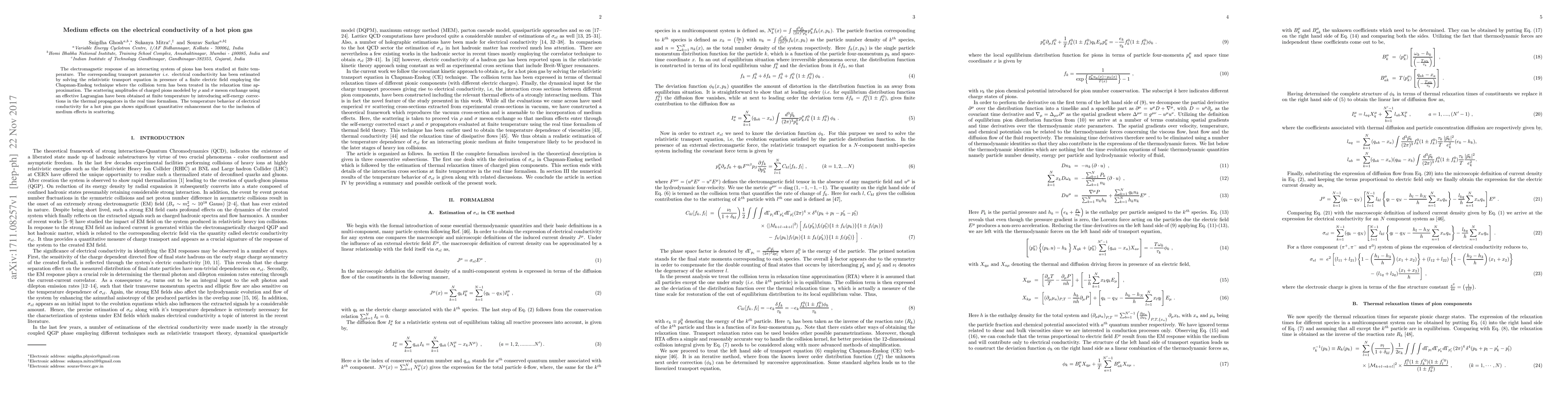 The electromagnetic response of an interacting system of pions has been studied at finite temperature. The corresponding transport parameter i.e. electrical conductivity has been estimated by solving the relativistic transport equation in presence of a finite electric field employing the Chapman-Enskog technique where the collision term has been treated in the relaxation time approximation. The scattering amplitudes of charged pions modeled by $\rho$ and $\sigma$ meson exchange using an effective Lagrangian have been obtained at finite temperature by introducing self-energy corrections in the thermal propagators in the real time formalism. The temperature behavior of electrical conductivity for a hot pion gas shows significant quantitative enhancement due to the inclusion of medium effects in scattering.