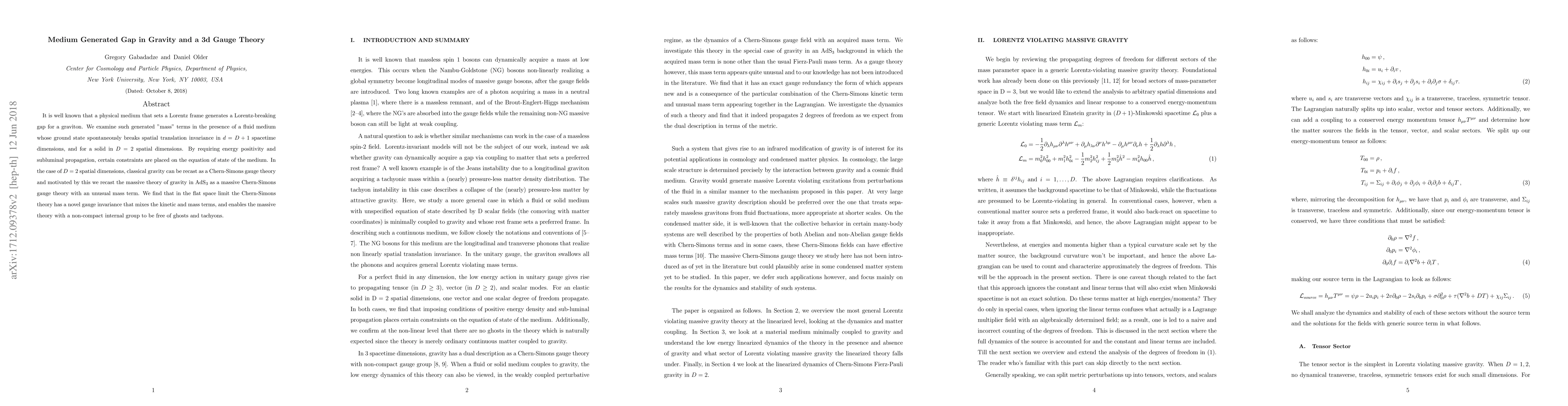 It is well known that a physical medium that sets a Lorentz frame generates a Lorentz-breaking gap for a graviton. We examine such generated "mass" terms in the presence of a fluid medium whose ground state spontaneously breaks spatial translation invariance in $d = D+1$ spacetime dimensions, and for a solid in $D = 2$ spatial dimensions. By requiring energy positivity and subluminal propagation, certain constraints are placed on the equation of state of the medium. In the case of $D = 2$ spatial dimensions, classical gravity can be recast as a Chern-Simons gauge theory and motivated by this we recast the massive theory of gravity in AdS$_3$ as a massive Chern-Simons gauge theory with an unusual mass term. We find that in the flat space limit the Chern-Simons theory has a novel gauge invariance that mixes the kinetic and mass terms, and enables the massive theory with a non-compact internal group to be free of ghosts and tachyons.