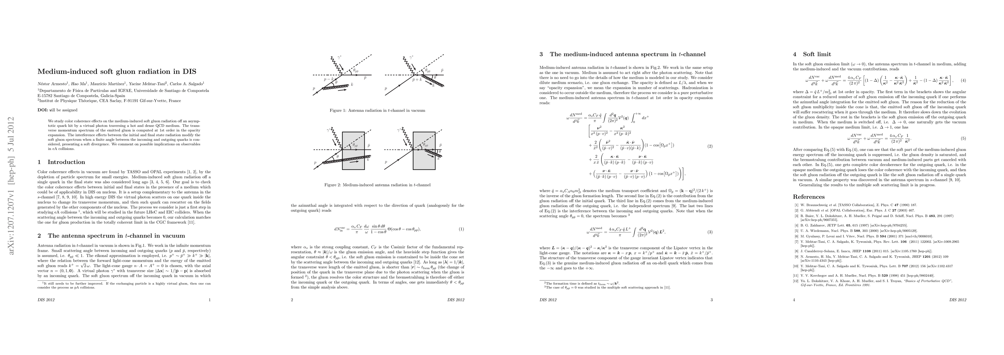 We study color coherence effects on the medium-induced soft gluon radiation off an asymptotic quark hit by a virtual photon traversing a hot and dense QCD medium. The transverse momentum spectrum of the emitted gluon is computed at 1st order in the opacity expansion. The interference effects between the initial and final state radiation modify the soft gluon spectrum when a finite angle between the incoming and outgoing quarks is considered, presenting a soft divergence. We comment on possible implications on observables in eA collisions.
