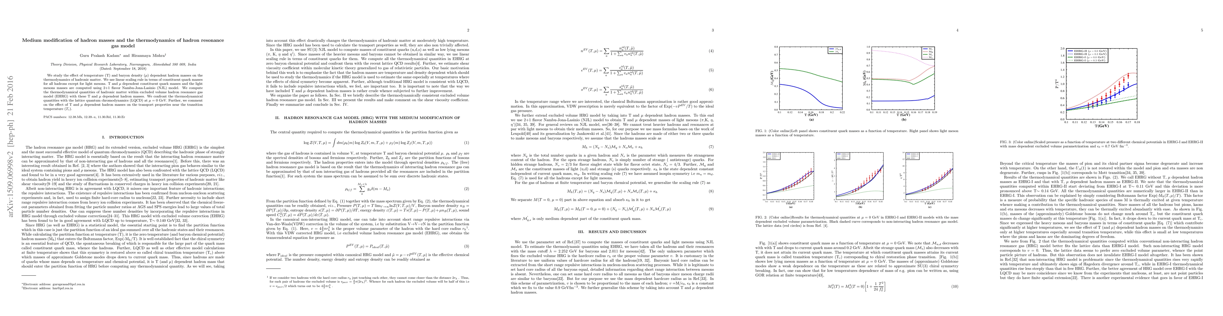 This paper investigates the impact of temperature and baryon density on hadron masses using the Nambu-Jona-Lasinio model, and computes thermodynamic properties of hadronic matter within the excluded volume hadron resonance gas model. It compares these results with lattice quantum chromodynamics data and discusses the influence on transport properties near the transition temperature.