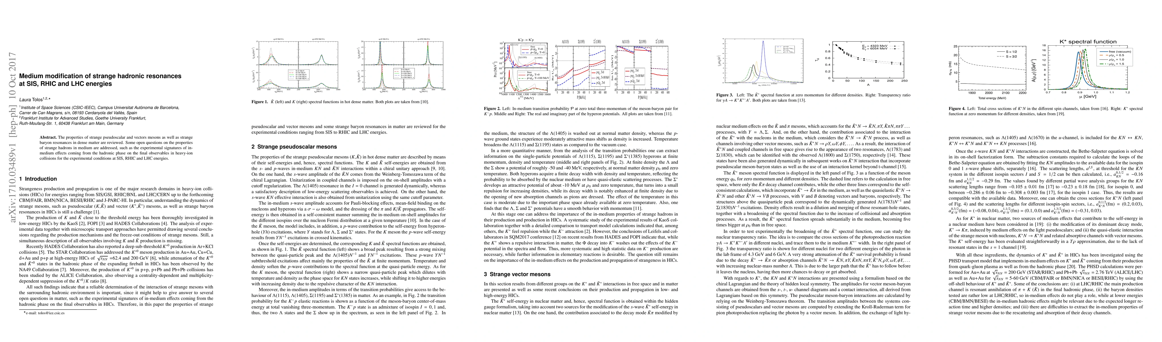 This paper reviews the properties of strange pseudoscalar and vector mesons, as well as strange baryon resonances, in dense matter, addressing open questions about their behavior in medium and experimental signatures of in-medium effects in heavy-ion collisions at SIS, RHIC, and LHC energies.
